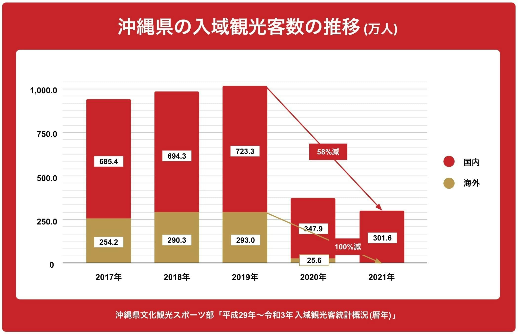 しかし、新型コロナウイルスの感染拡大に伴い、観光客数は激減し、2021年は301万人と、2019年対比で70.3%の減少となり、入域観光客数は二年連続で前年を下回り、外国人観光客は、日本への入国制限などが影響し、沖縄の本土復帰以後、初めて0人となりました。