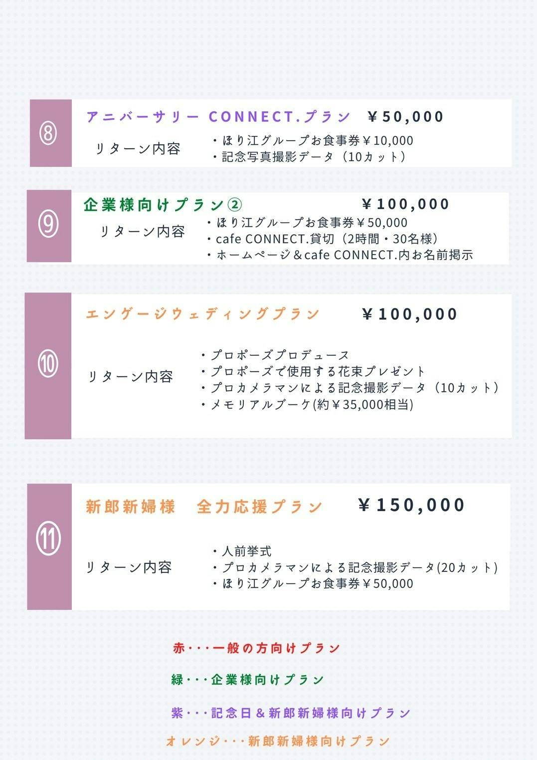 アニバーサリープランとして、結婚記念日はもちろん、付き合った記念日、誕生日、入学記念など様々なイベントで写真を撮って楽しく話をして食事をして想い出のアルバムの1ページをcafe CONNECT.で過ごしてみませんか?そしてアニバーサリーの記念にもう一度プロポーズしてみませんか?