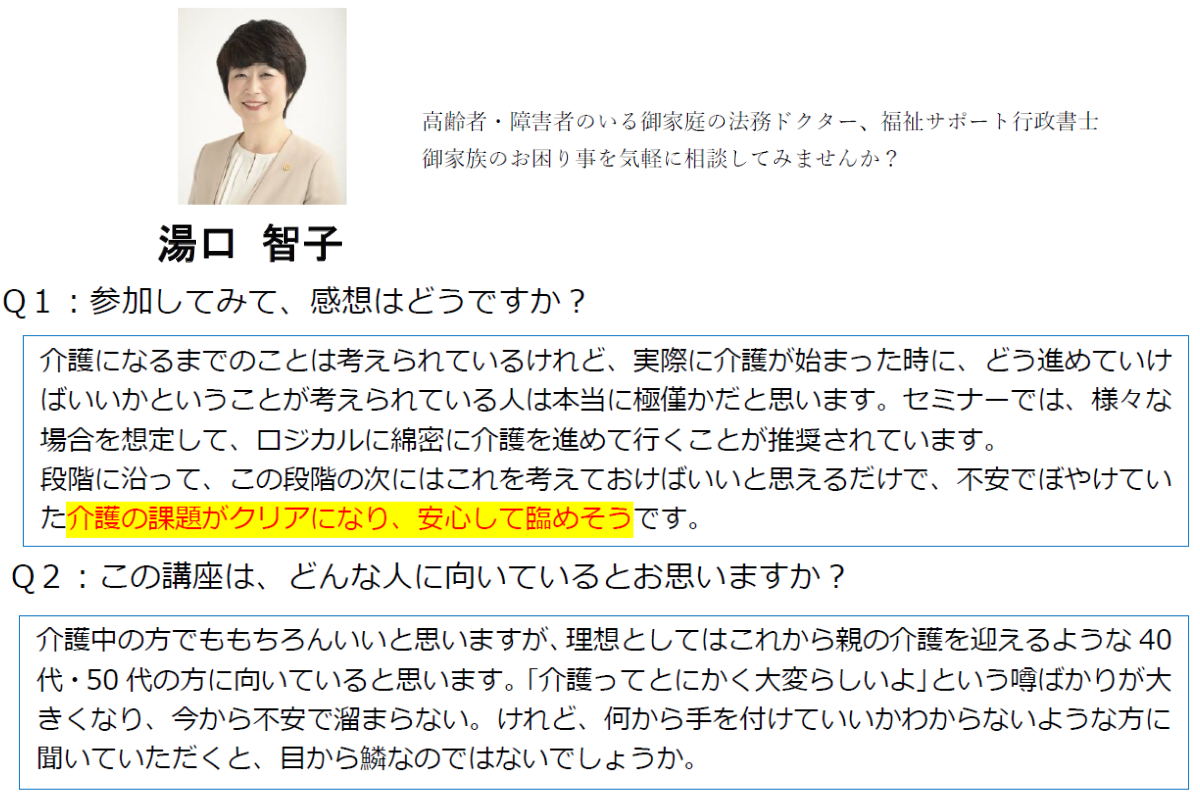 ※有資格者等の専門家ではなく、介護経験者としての知見に基づくセミナー内容です。