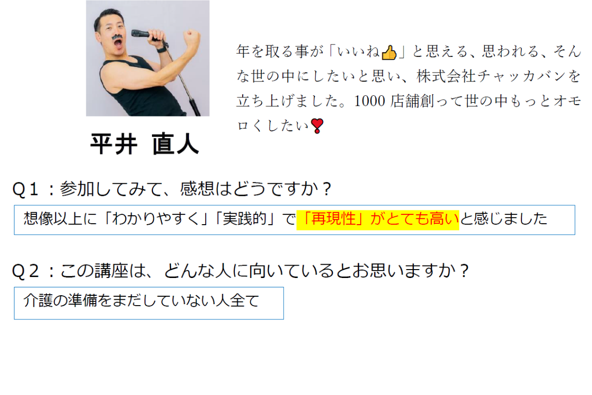 ホワイト介護は体のケア方法ではなく、介護との向き合い方や備え方など基本となる考え方をお教えしています。今、介護真っ只中の人にとっては見直す機会に、まだ目の前に介護が迫っていない人には、今から知っておくことで備えることができ、介護に直面した時に不安や迷いが少なくなる方法です。今から知ることで、漠然とした不安をなくし選択肢を用意しておくことで、いざ本当に介護の問題に直面した時に悩まず迷わず解決できます。ホワイト介護は皆様の最強の武器になれるのではないかと思っています。