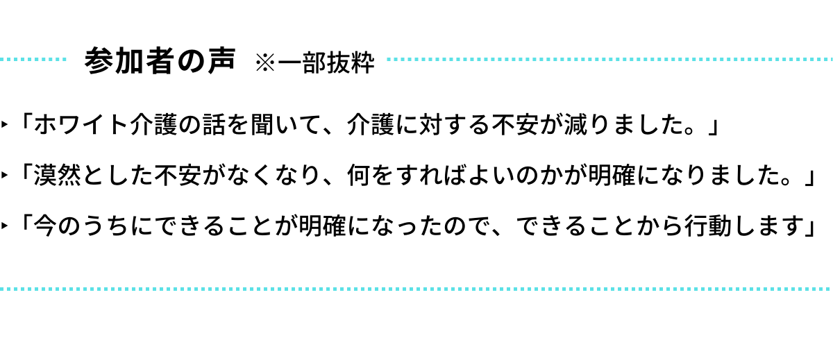 ホワイト介護は単に介護の方法をお教えするわけではありません。介護への向き合い方や備え方について知ってもらった後に、自分のケースに当てはめて考えるワークショップの時間を設けています。そのため、話を聞いてすぐに実践すべきことが目に見えて分かります。明日やる事、はじめの一歩がその場で分かるのがホワイト介護です。