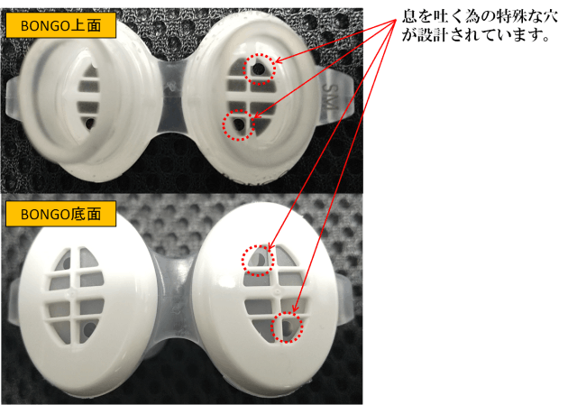 実は吐く息を利用していびきをケアする構造になっています。例えるのであれば、人工呼吸器などに使われる1方向弁のような仕組み。。さらに簡単に言うと、石油ストーブに灯油を補給するときにシュポシュポって使ったことありませんか?1方向に灯油が流れるけど逆方向には流れない。そんなイメージで、息を吸うときは普通に吸えますが、息を吐くときにはこの小さな穴から息が排出される仕組みです。。とにもかくにもまずは使ってみていただきたい商品です!ボンゴはご自身の呼吸を利用していびきをケアできる素晴らしいアイデアのもとに生まれた商品なんです!