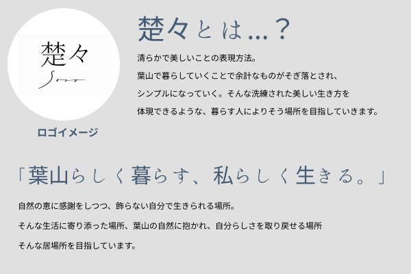 「楚々」とは、意味を調べると清らかで美しいことの表現方法。葉山での暮らしの中で自然と余計なものがそぎ落とされ、シンプルになっていく。自分にとって本当に大切なものを丁寧に選び取っていく。そんな洗練された美しい生き方を体現できるような、葉山で暮らす頑張る人々に寄り添う、優しい場所を目指していきます。