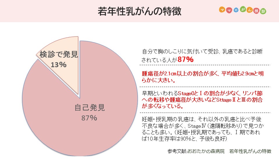 若年性乳がんは、がんが大きくなってから発見される傾向があり、大きくなってから見つかるため、転移などが起きていることが多く、発見時の病期(ステージ)も、若年性乳がんの方が進んでいる傾向があることがわかっています。