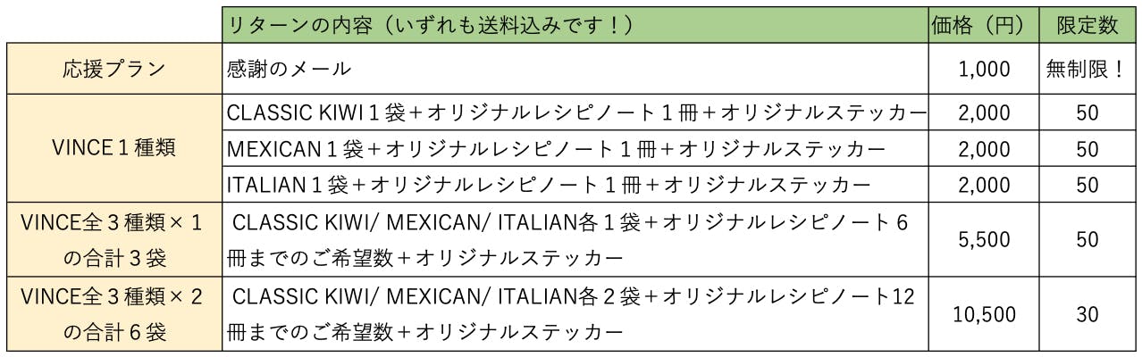 6種類のリターンをご用意いたしました。VINCEの商品「CLASSIC KIWI」「ITALIAN」「MEXICAN」をお届けします。さらに、弊社で制作したVINCEのオリジナルレシピノート(全20ページ)とVINCEオリジナルステッカーもお付けします。価格は送料込みです。