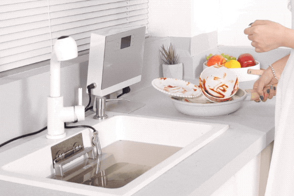 スペースも、工事も不要。スイッチを入れるだけであっという間にお家のシンクが食洗器に。