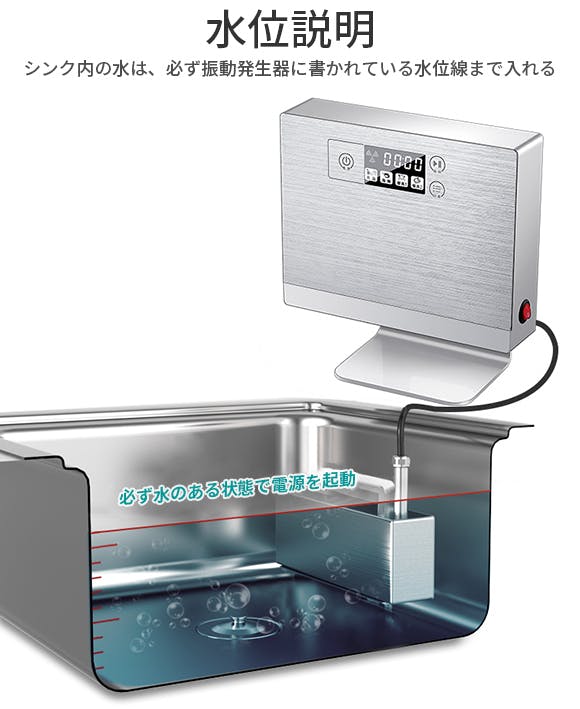 ※必ず超音波発生器が全部水に浸かるようにしてご使用ください。水に浸かっていない状態での使用は故障の原因となります。