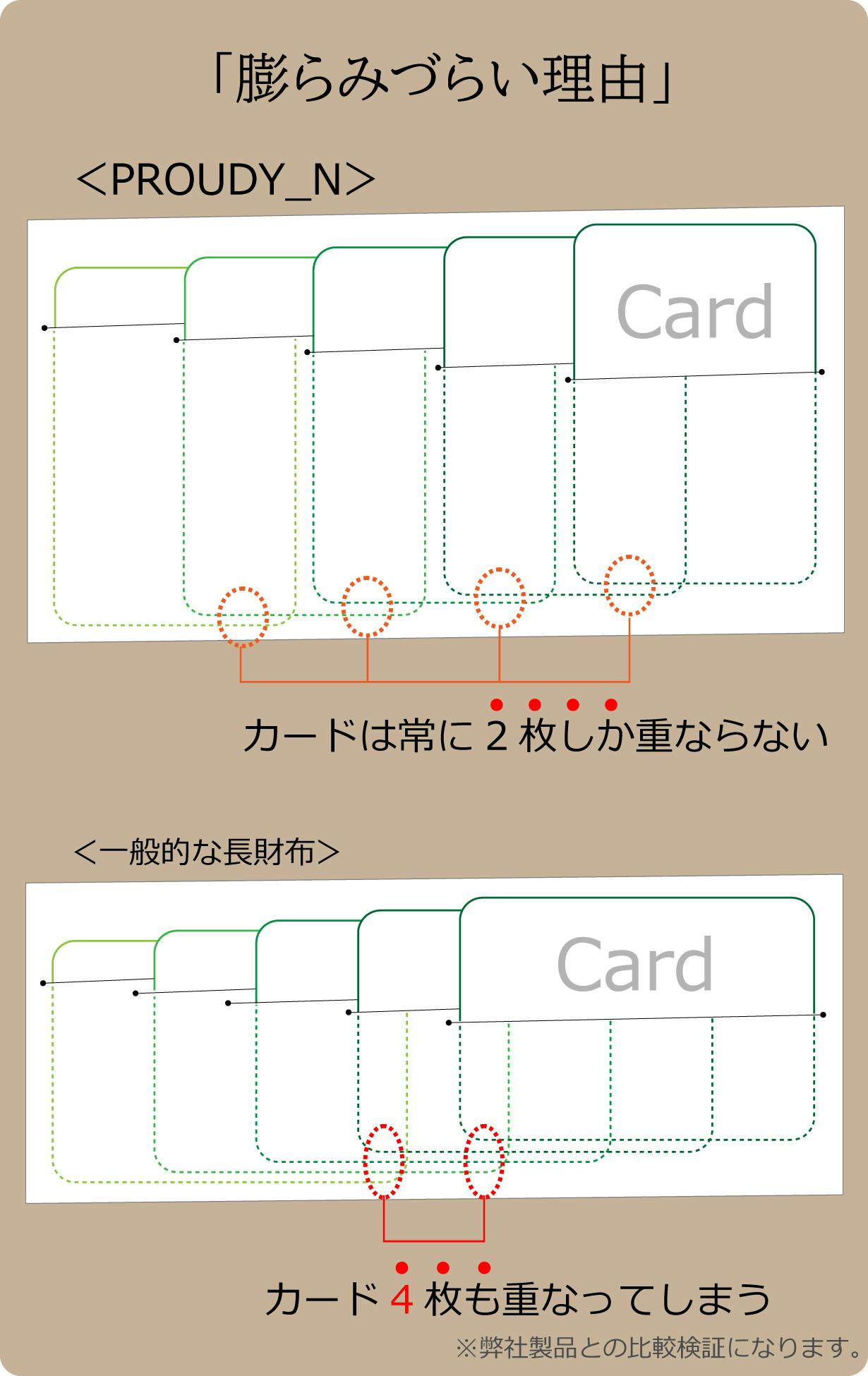 通帳も収納可一般的な財布が膨らんでしまう原因は、解説画像の様にカードが何重にも重なってしまう事が要因です。この事によりファスナーに負荷がかかり開閉時のすべりが悪くなる場合もあります。「PROUDY_N」は解説画像の様に中央のカード段に5枚入れてもカード同士の重なりが常に2枚になる仕様で厚みが均一になり極端に1部分が膨らんでしまうという現象が起きづらい独自設計になっています。これにより財布自体が膨らみづらくなります。さらにファスナ―への負担軽減にもつながります。