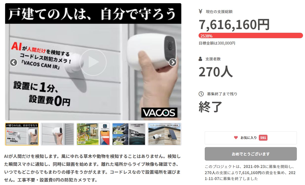 前回のキャンペーンで760万円の売上を記録したVACOS CAM IRが、