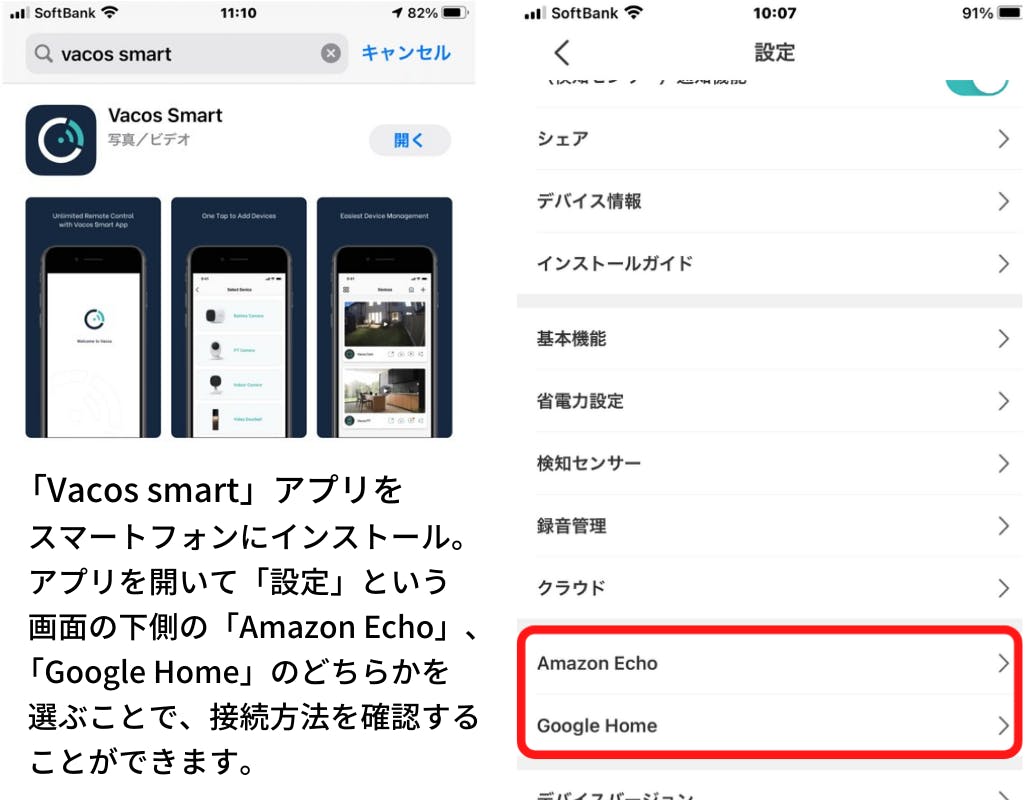 それぞれの接続方法は、「Vacos Smart」アプリ内で詳細を確認することができます。