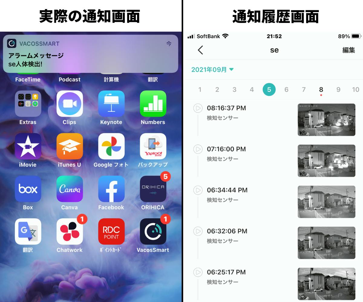 左側の画像のように、人間を検知するとスマートフォンにプッシュ通知されます。プッシュ通知をタップすると、右側の画像のように検知履歴を時系列で確認することができます。