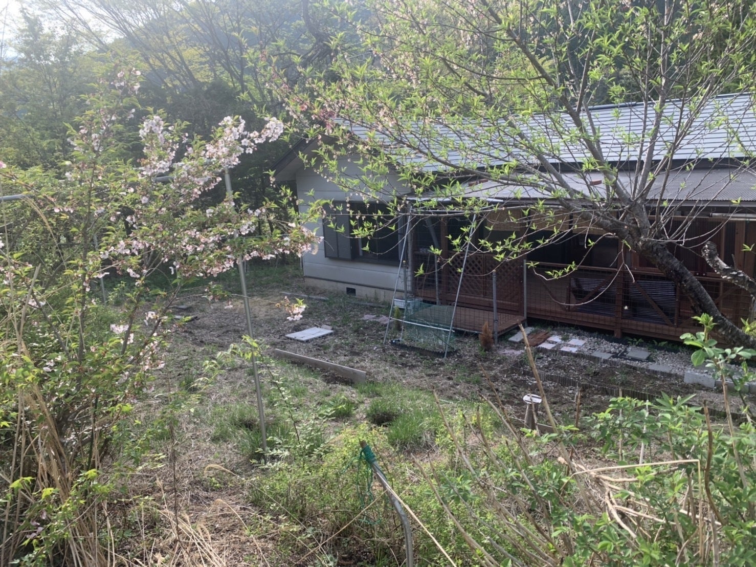 この庭の奥に見える林の辺りまで土地が広がっていて、しっかり整備してサウナ小屋や水風呂などを設置していく予定です!