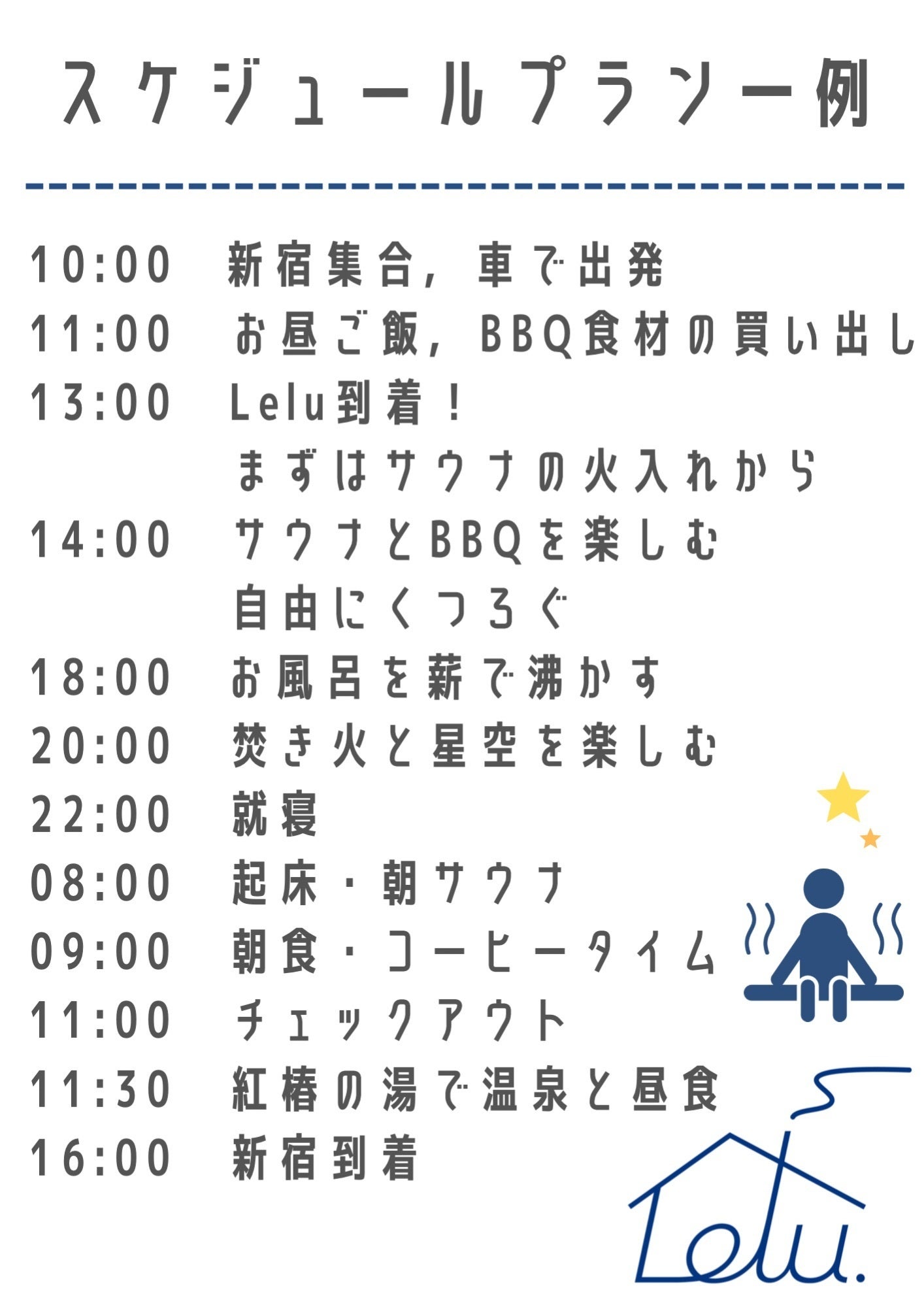 混雑が気になるこのご時世。アクリルスタンドで大切な方との距離ができてしまう事もあったと思います。Leluは1日1組限定です。サウナ、お風呂、BBQ、焚き火などを混雑を気にせず大切な方との時間を楽しんでいただくことができます。