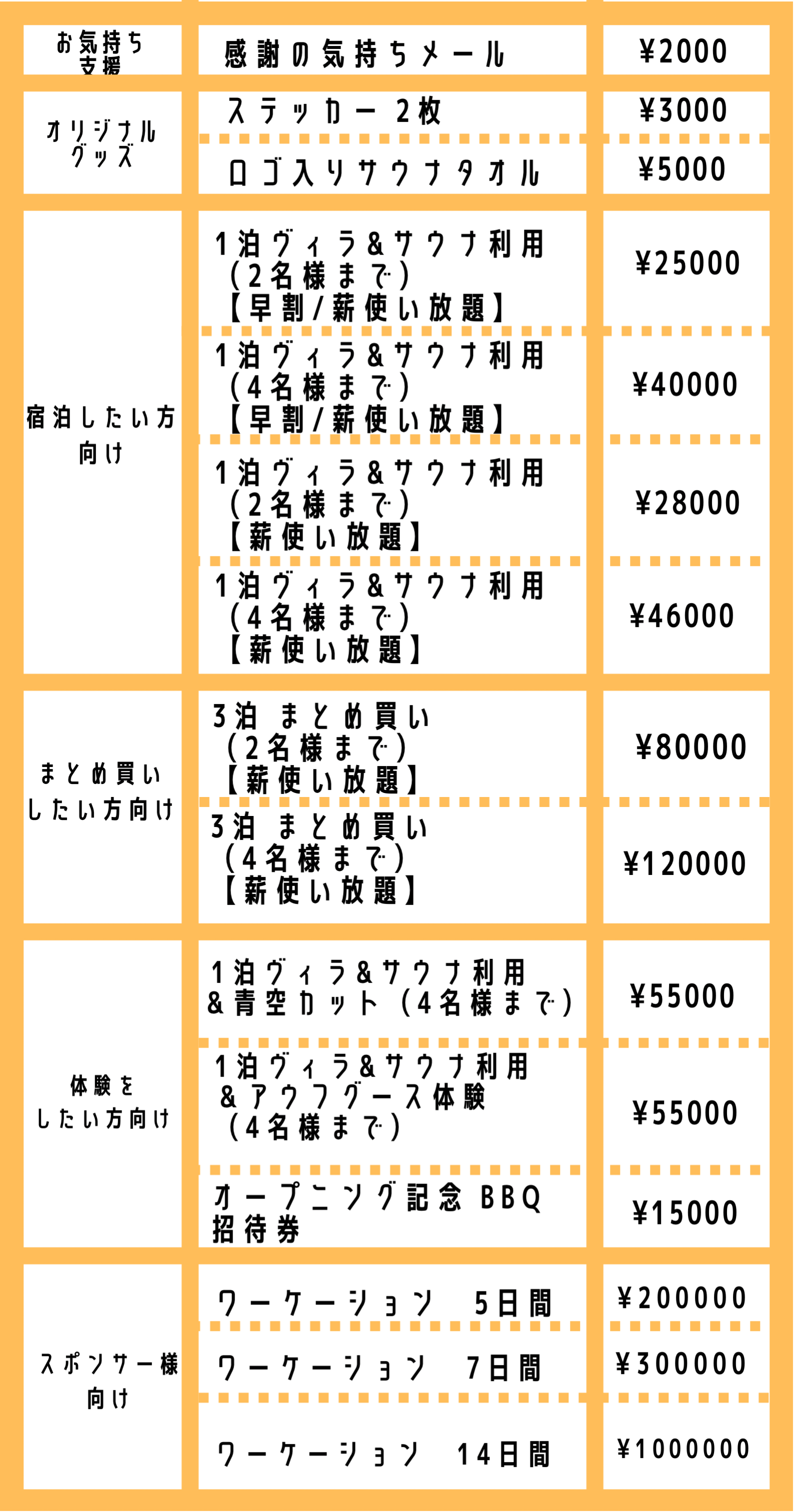 2022/09/30 21:00大変お待たせしておりましたが、ついにプレオープンをスタートさせていただきます!そちらに伴いまして、HPも公開させていただきます!コチラからチェックお願いします→ Lelu HPまだ準備中の箇所も多数ありますが随時更新していきます!台風の影響で、作業が出来なかったり、近くにあった木が倒れて、なんとサウナ小屋に激突し、撤去しなければいけなくなってしまったり、、予期せぬトラブル続きで当初の予定よりもお知らせが大分遅くなってしまい、ご迷惑をおかけしました。まだまだ細かい所まで手が行き届いていない状態ではありますが、せっかく完成しているサウナ小屋をいち早く皆様に体験していただきたく、10月中旬からプレオープンする事にしました!現時点では、10月9日以降からご予約を承る予定です!作業状況によっては変更になる可能性もございますので、ご了承下さい( ; ; )プレオープン期間中は申し訳ありませんが、ゲストの皆様自身での原状回復、セルフクリーニングをお願いします。(正式オープン後は清掃業者さんお願いする予定です!)ハウスルールをお守りいただける方のみご予約下さいませ。HP、公式LINEアカウントに記載しておりますのでご確認をお願い致します。プレオープンオープン期間中はこちらの料金でご案内させていただきます。【宿泊利用】¥30,000(税込)【デイユース】¥20,000(税込)人数は8名様まで、人数追加のご料金はいただきません。プレオープン限定の特別価格ですのでこの機会にいち早く体験に来ていただけると嬉しいです♪今回のプレオープンに関しては、リターンとは別で考えています。(せっかくご支援いただいた皆さんには完成した状態で来て欲しいという気持ちです!)リターン利用のご希望等はご相談下さい!プレオープンということで至らぬ点も多いかと思いますが、どうか大目に見ていただけると嬉しいです!よろしくお願い致します。★ご予約についてプレオープンに関しましては予約フォームを使わず、公式LINEアカウント、InstagramのDM、CAMPFIREにてお問い合わせをお願い致します。LINE公式アカウントはコチラからお友達追加をお願いします。正式オープンにつきましては、プレオープンの状況やこちらの準備が整い次第再度お知らせさせていただきます!お待たせしてしまい申し訳ありませんが、どうぞ引き続きよろしくお願い致します!丸山 もっと見る