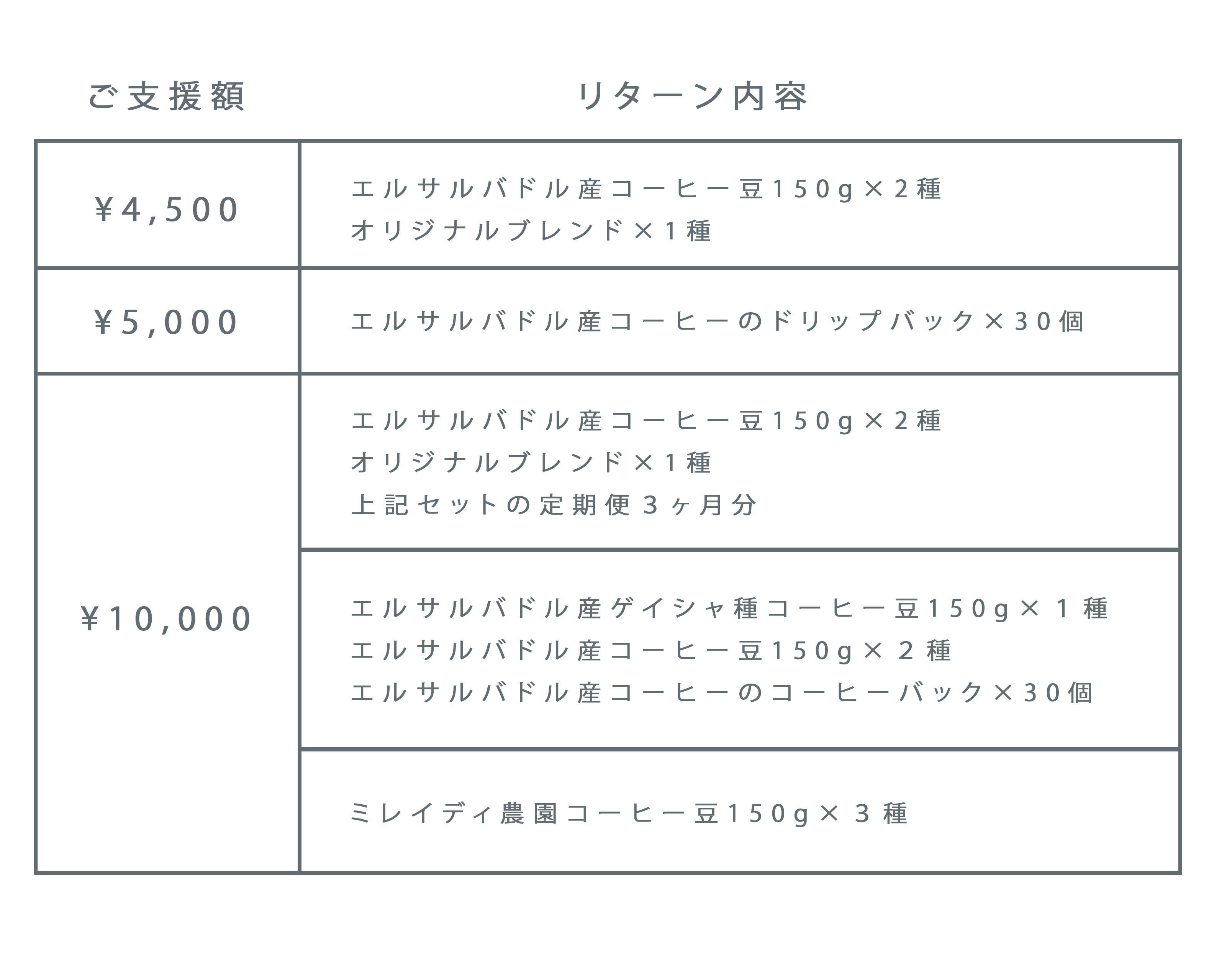 今回のクラウドファンディングでは全国のご家庭でコーヒーを楽しんでいただいている方にはエルサルバドル産のコーヒー豆のセット(粉にもできます!)やドリップバックなどを。いつもウッドベリーコーヒーをご利用していただいているお客様にはお得なプリペイドカードやドリンクフリーチケットをリターン品としてご用意させていただきました。また、自家焙煎やカフェなどの店舗を運営されている方にもご利用いただけるセミナーや生豆のリターンもご用意させていただきました。輸入のコンテナは6月~7月にエルサルバドルを出港予定ですので、リターンの発送は秋頃を予定しています。