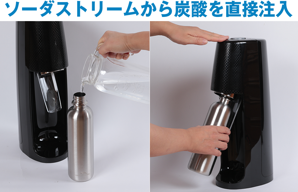 MATE OF STEELは家庭用の炭酸水製造機「ソーダストリーム」に対応したステンレスボトル。