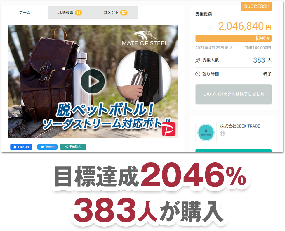 昨年、Greenfundingで目標達成2046%・383人が購入した人気ボトル【MATE OF STEEL】