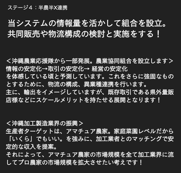 今の沖縄農業には、有機的な繋がりがまだ足りないと感じているので、それをこのシステムで解決し、この世界観の実現に向けてチャレンジします。