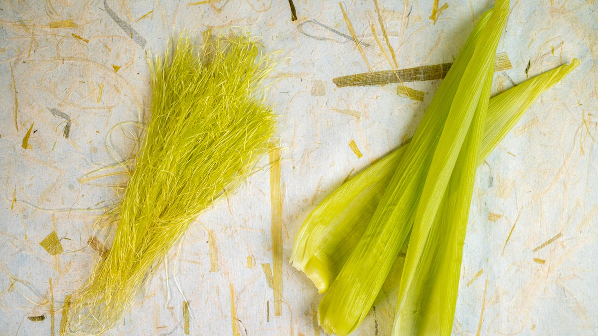 ▲スイートコーンの皮やひげを漉き込んだ和紙の試作品。