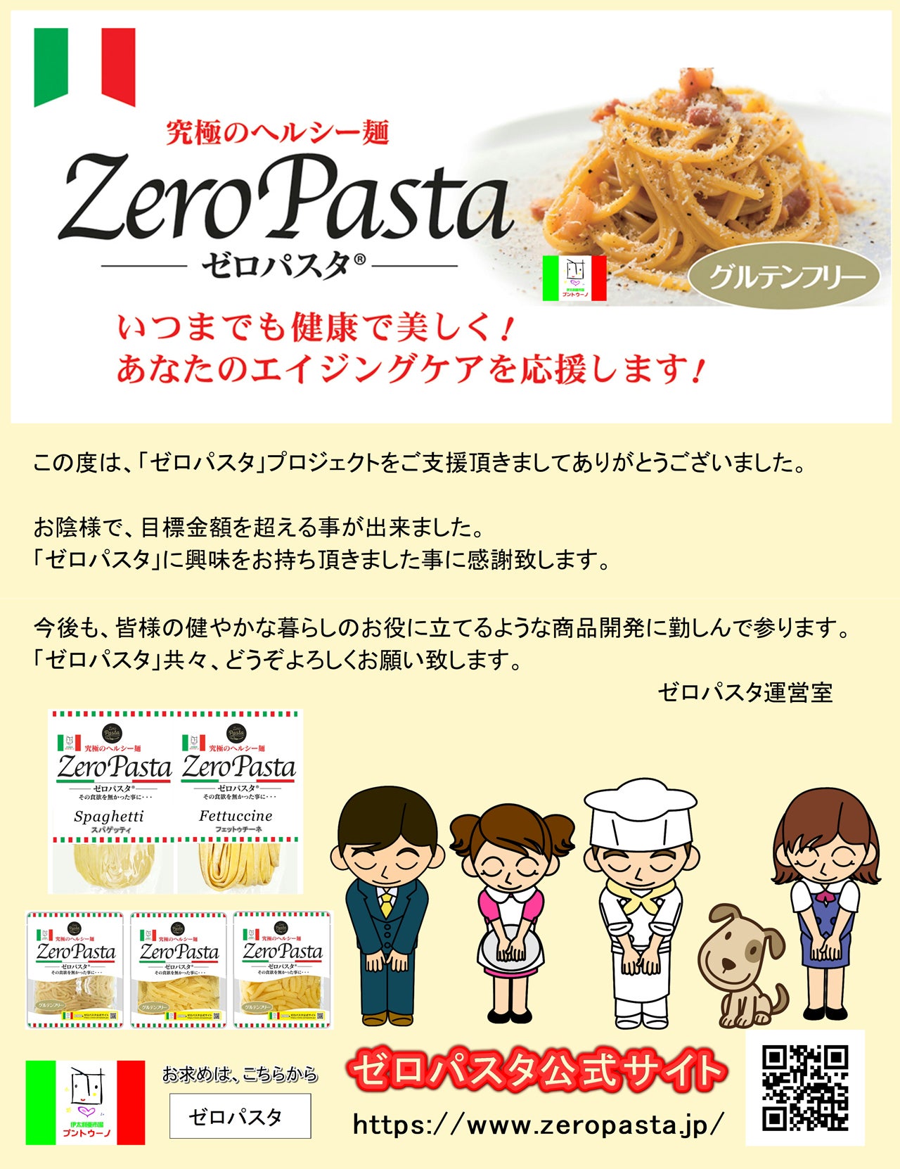 パスタの味に最も厳しいであろうイタリアの方々から認められれば、「ゼロパスタ」は、世界を席巻できると考えています。