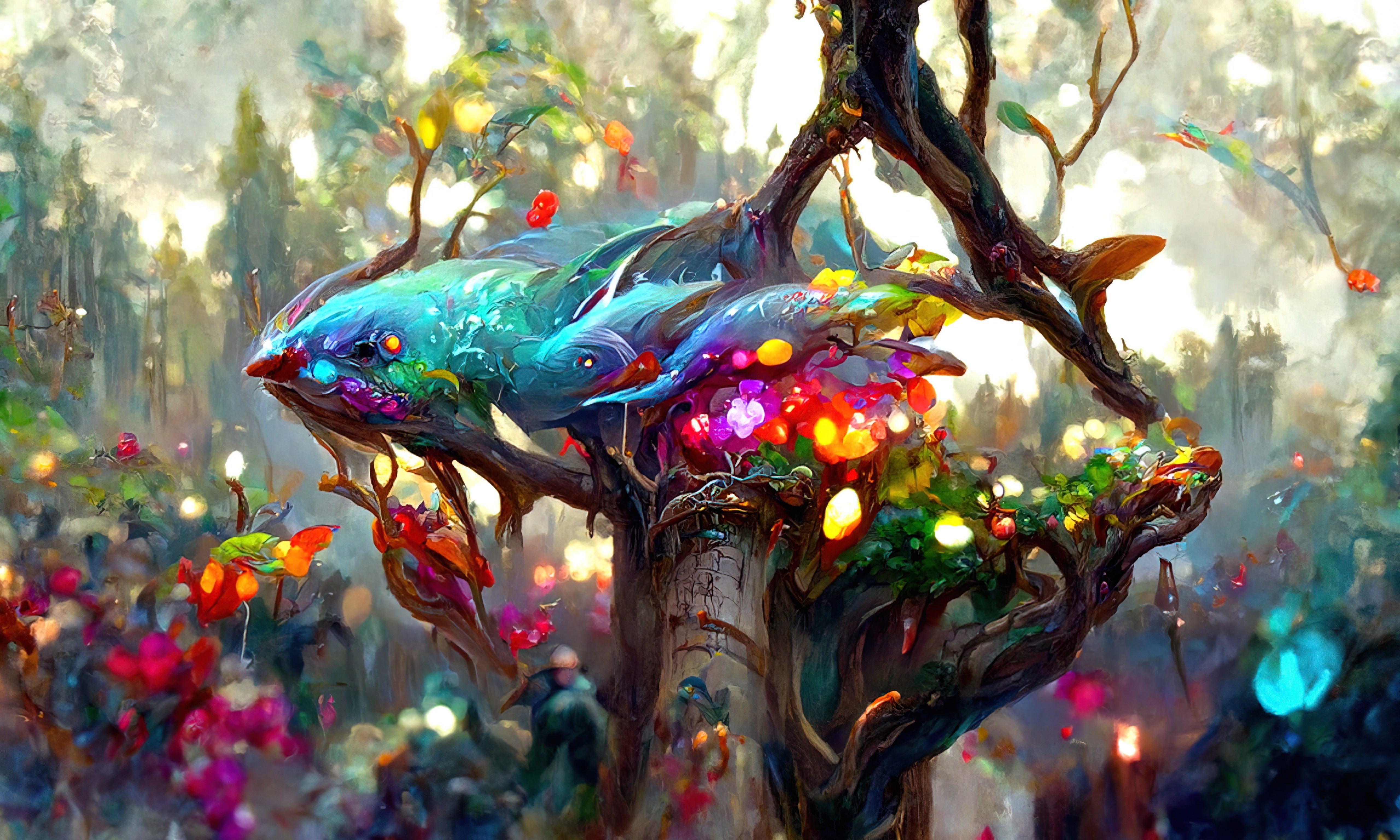 2枚目の文章:霧の森には宝石の木が生え、空には色とりどりの光る魚が泳いでいる