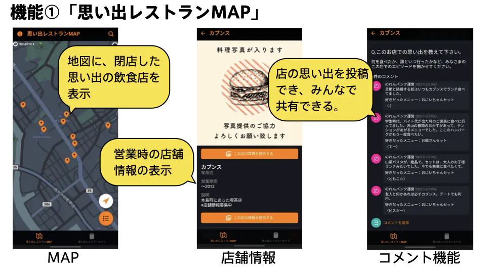 機能の1つ目は、閉店してしまい、今は街に存在しない人気店だけが並ぶ、「思い出レストランMAP」です。