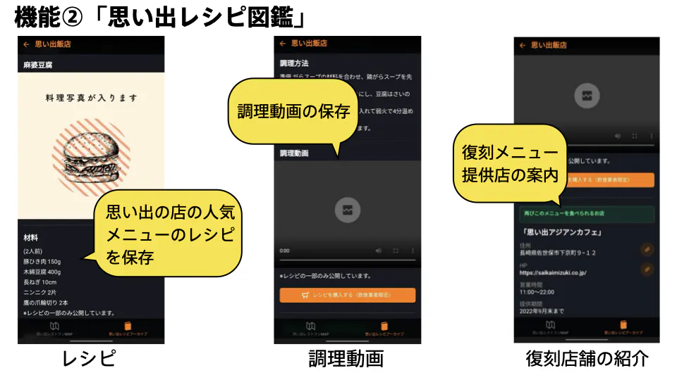 この2つの機能で「まちの味の記憶」を、保存しておくことで、人気料理を再現したいという料理人が現れた時に、街の思い出の料理を甦らせる大きな助けになるのではと考えています。