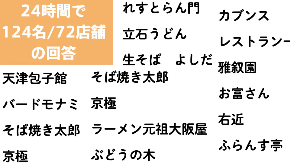 アプリ化の前段階として、佐世保の地域Webメディアである「させぼ通信」さんの協力で、「今はもう食べられなくなった、あなたの思い出の店と、思い出のメニューを教えて下さい」という内容のアンケートを実施したところ、ほぼ一日で124名、72店舗のアンケートが戻ってきました。(その後も、回答は増えています。)