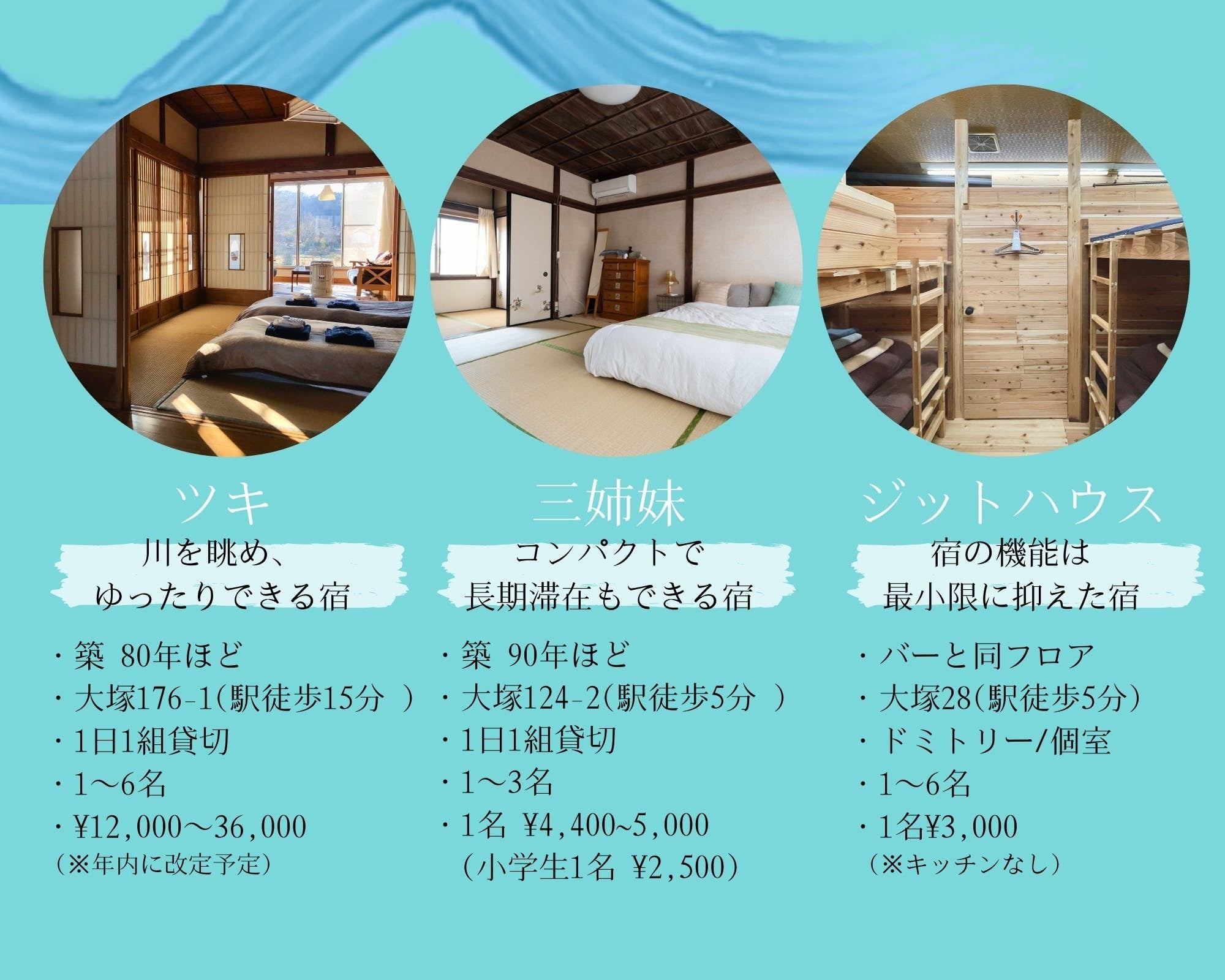 3つの宿泊施設は、駅徒歩15分圏内のいわゆる宿場町エリアにあります。「ツキ」と「三姉妹」は古い民家を再活用し、今年の秋にオープン予定の「ジットハウス」はバーや音楽・ダンススタジオがある建物の一角(元雀荘!)を改装するなど、町の歴史や文化を垣間見られる仕様になっています。