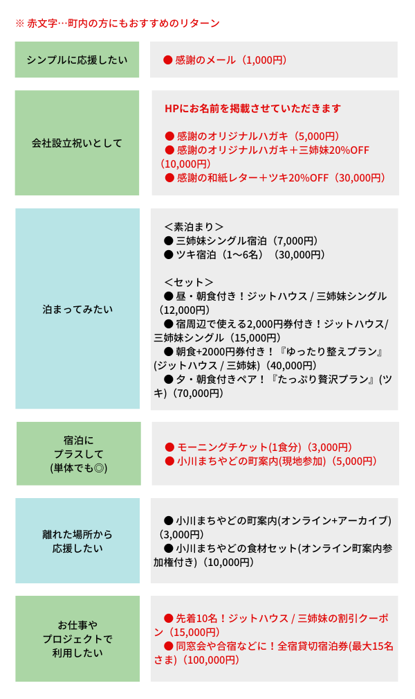 遠方で小川町に来るのが難しい方や、逆に近くに住んでいて宿泊はしない…という方にもご参加いただけるように工夫していますので、ぜひ右側の個々のリターンの詳細も見てもらえたら嬉しいです。