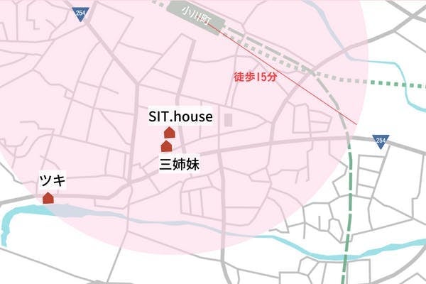 3つの宿泊施設は、駅徒歩15分圏内のいわゆる宿場町エリアにあります。「ツキ」と「三姉妹」は古い民家を再活用し、今年の秋にオープン予定の「ジットハウス」はバーや音楽・ダンススタジオがある建物の一角(元雀荘!)を改装するなど、町の歴史や文化を垣間見られる仕様になっています。