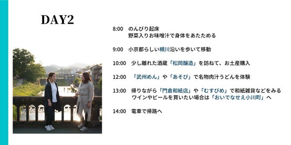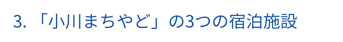 それでは、さっそく、「小川町」と「小川まちやど」を構成する3つの宿泊施設の紹介をいたします。