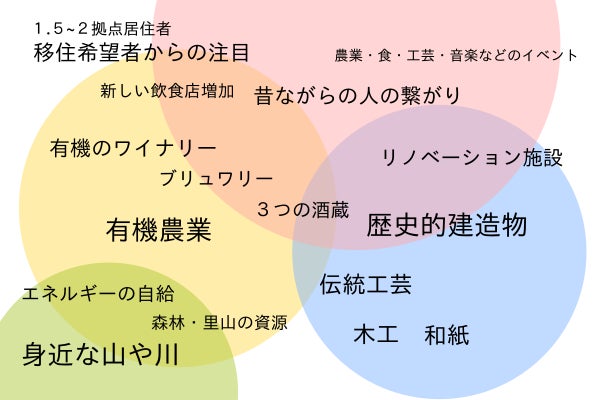 伝統工芸・歴史的な街並み・山や川などの自然、有機野菜・食・酒…などの物的な資源と、それらを利用して催されるマルシェや農業体験などの大小様々なイベント、そして、ほど良い田舎らしさが心地よいコミュニティ。