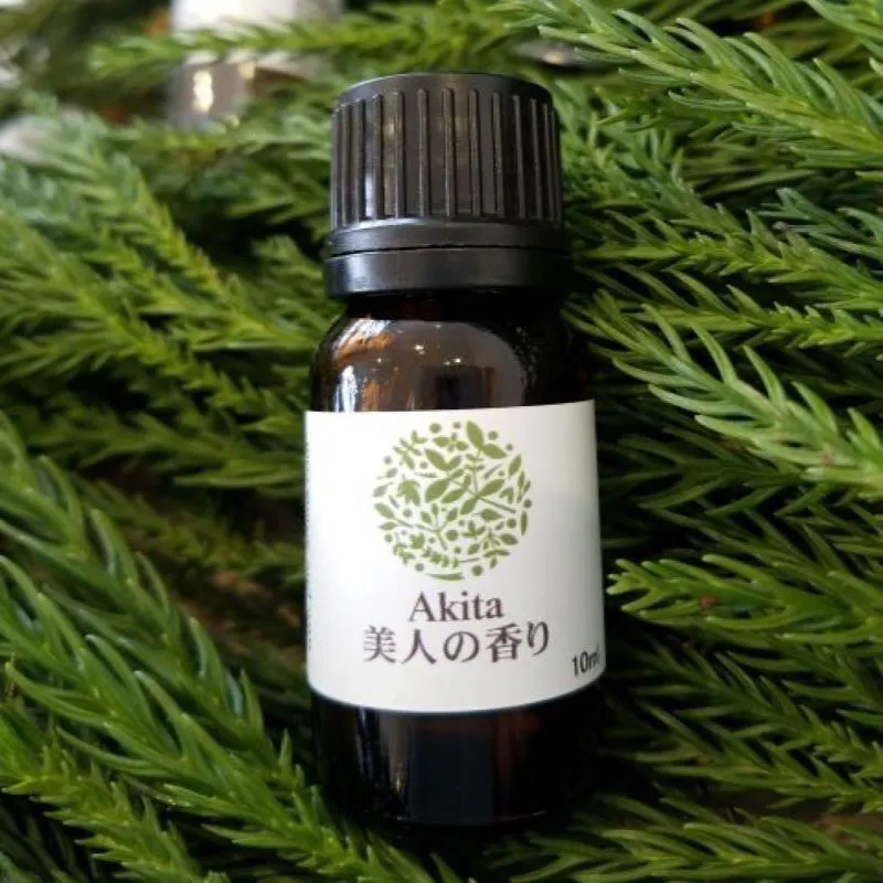 一つは、「Akita美人の香り」。秋田杉精油とラベンダー、マジョラムをブレンドした精油で、美人をイメージした高貴な香りに仕上げました。秋田美人に優しくされた時のような鎮静作用(?)があり、リラックスできると評判です。自宅にいながら森林浴が出来るような深く優しい香りです。