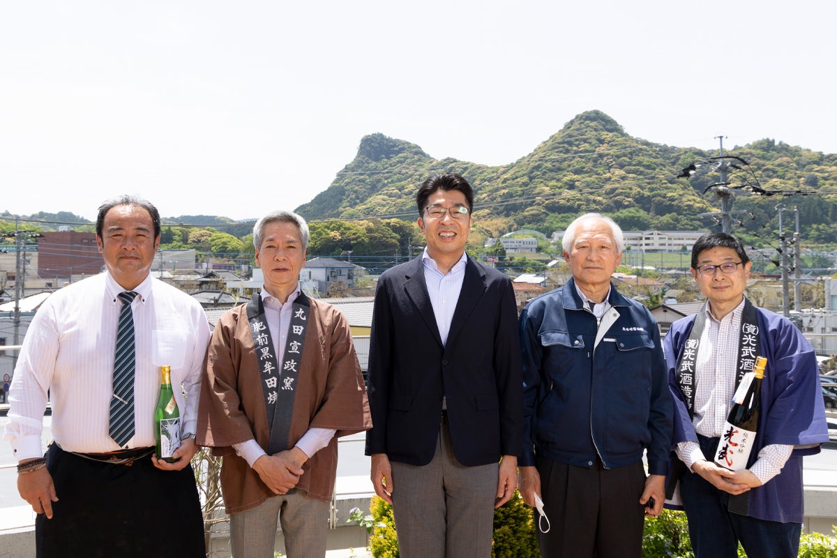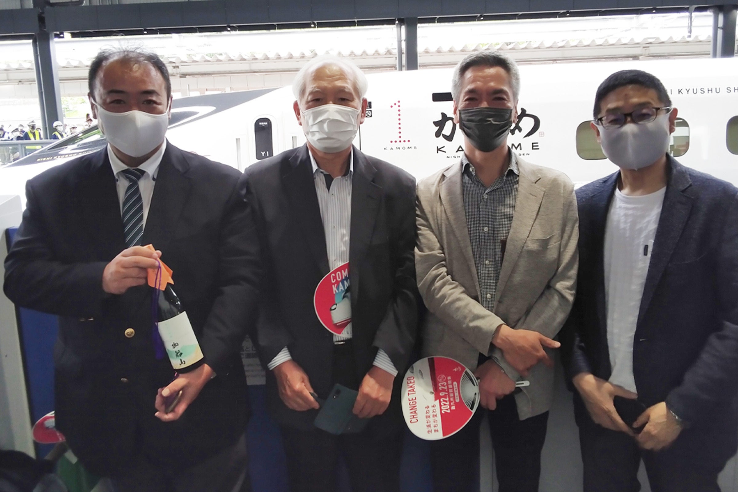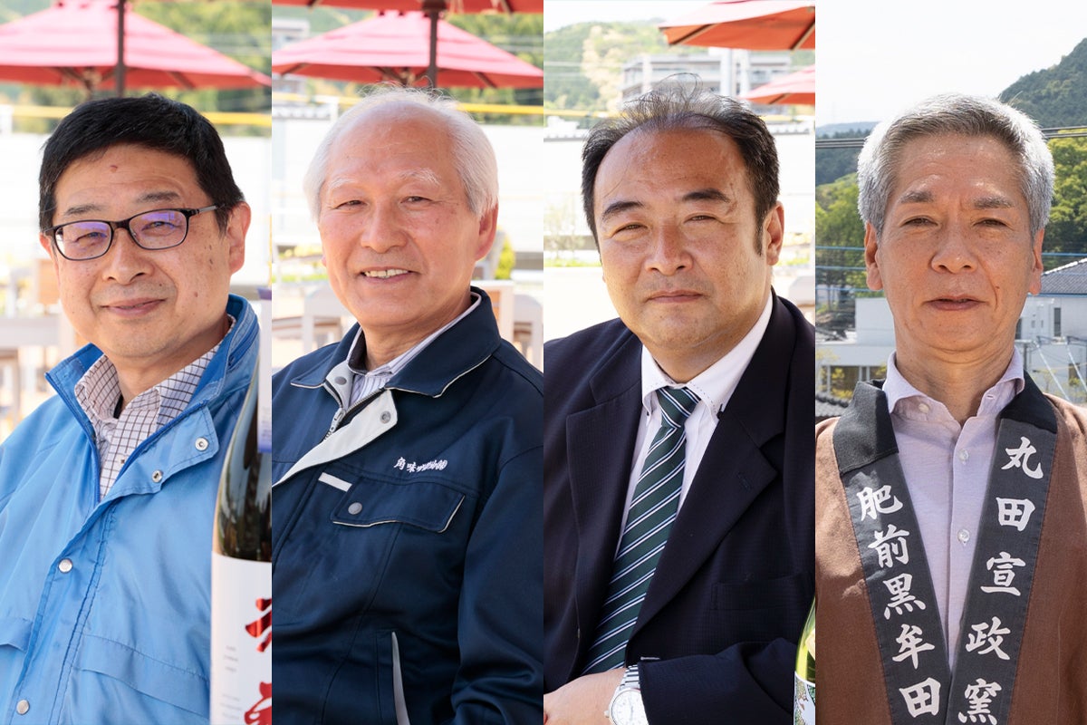 「武雄鹿島新幹線・開業記念コラボプロジェクト事務局」は、武雄駅に新幹線の駅ができることを記念し、佐賀県を訪れる皆様が喜んでいただけるようなお土産を作りたいと、武雄市にある牟田酒造場・牟田勝浩(写真左)、黒牟田焼 丸田宣政窯・丸田延親(写真左から二人目)、角味噌醤油・角良孝(写真右から二人目)、鹿島市にある光武酒造場・光武博之(写真右)の4人が立ち上げたプロジェクトです。ちなみに、写真の中央は、武雄市の小松市長です。