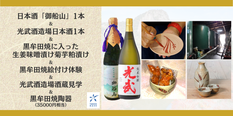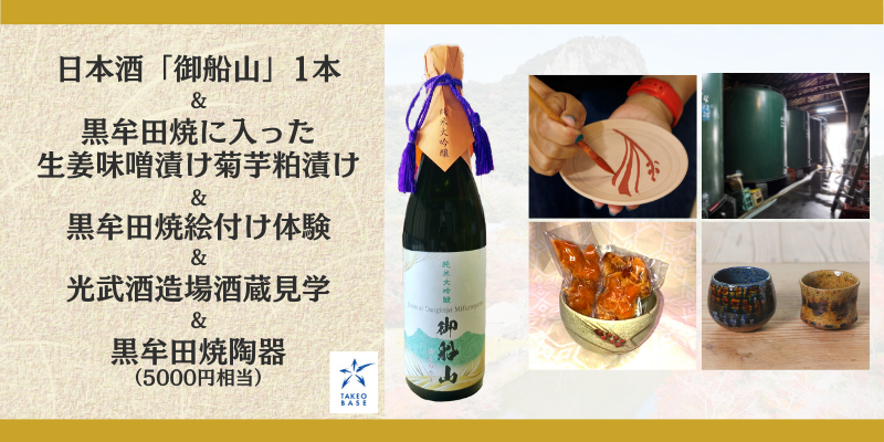 ▼【30,000円】日本酒御船山1本&黒牟田焼に入った生姜味噌漬け菊芋粕漬け&黒牟田焼絵付け体験&光武酒造場酒蔵見学&黒牟田焼陶器(5000円相当)