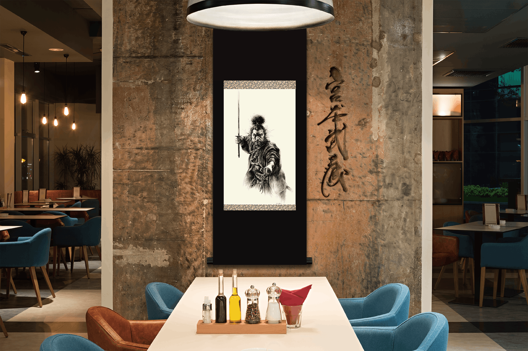 宮本武蔵の掛け軸も従来の床の間はもちろんのこと、街中のホテル、レストラン、日本料理店、寿司屋、古民家カフェ、BAR、ヘアサロン、道場など、プライドをかけ、技を磨く象徴として飾る。そしてお客様をおもてなしする。