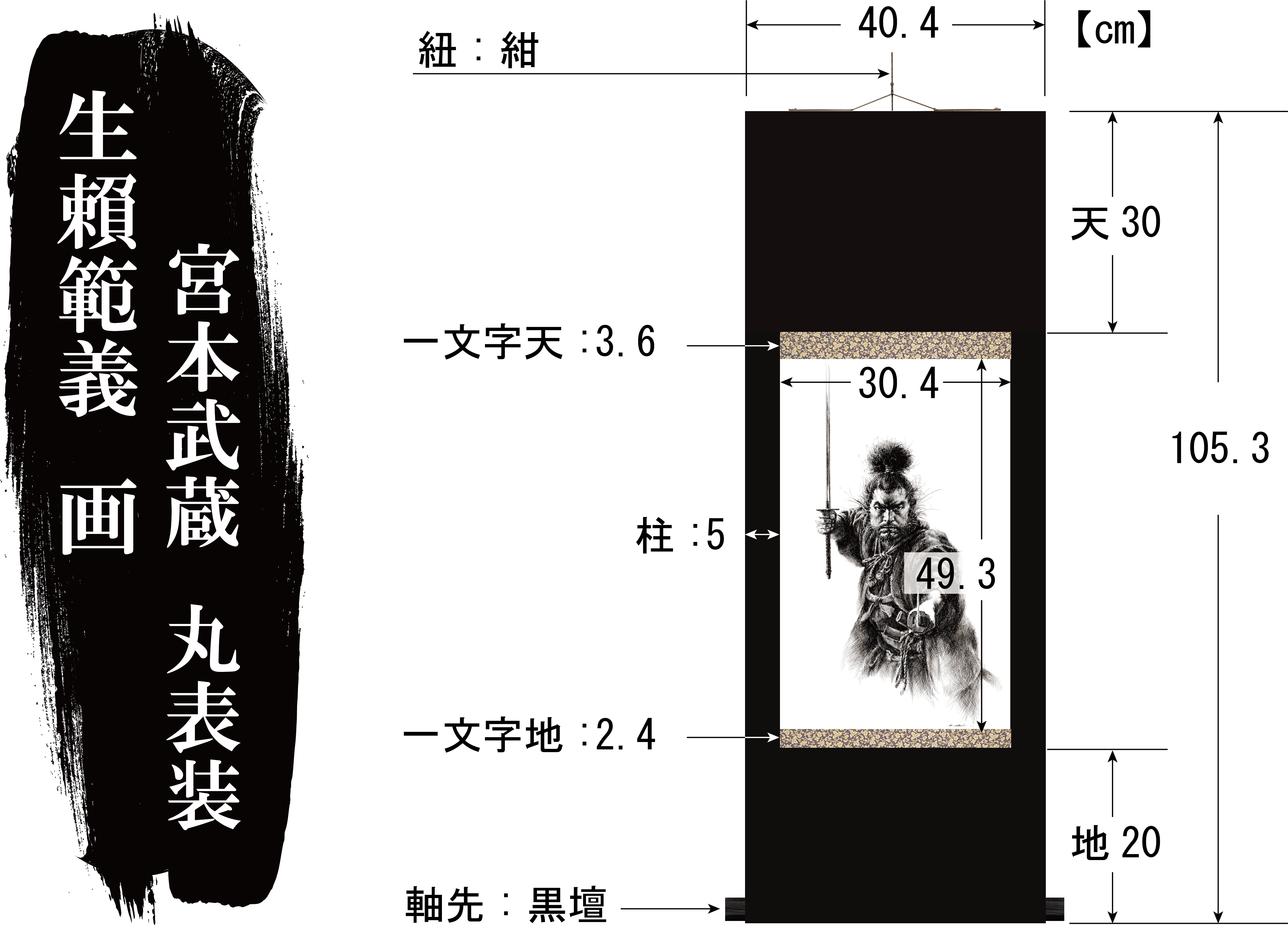 『剣豪 宮本武蔵』に相応しい表装として『丸表装』を選択。作品本紙との取り合わせで最も重要な上下一文字以外を同じ生地で仕立てた、風帯もないシンプルな表装で絵の勢い、迫力を押し出した掛け軸になります。