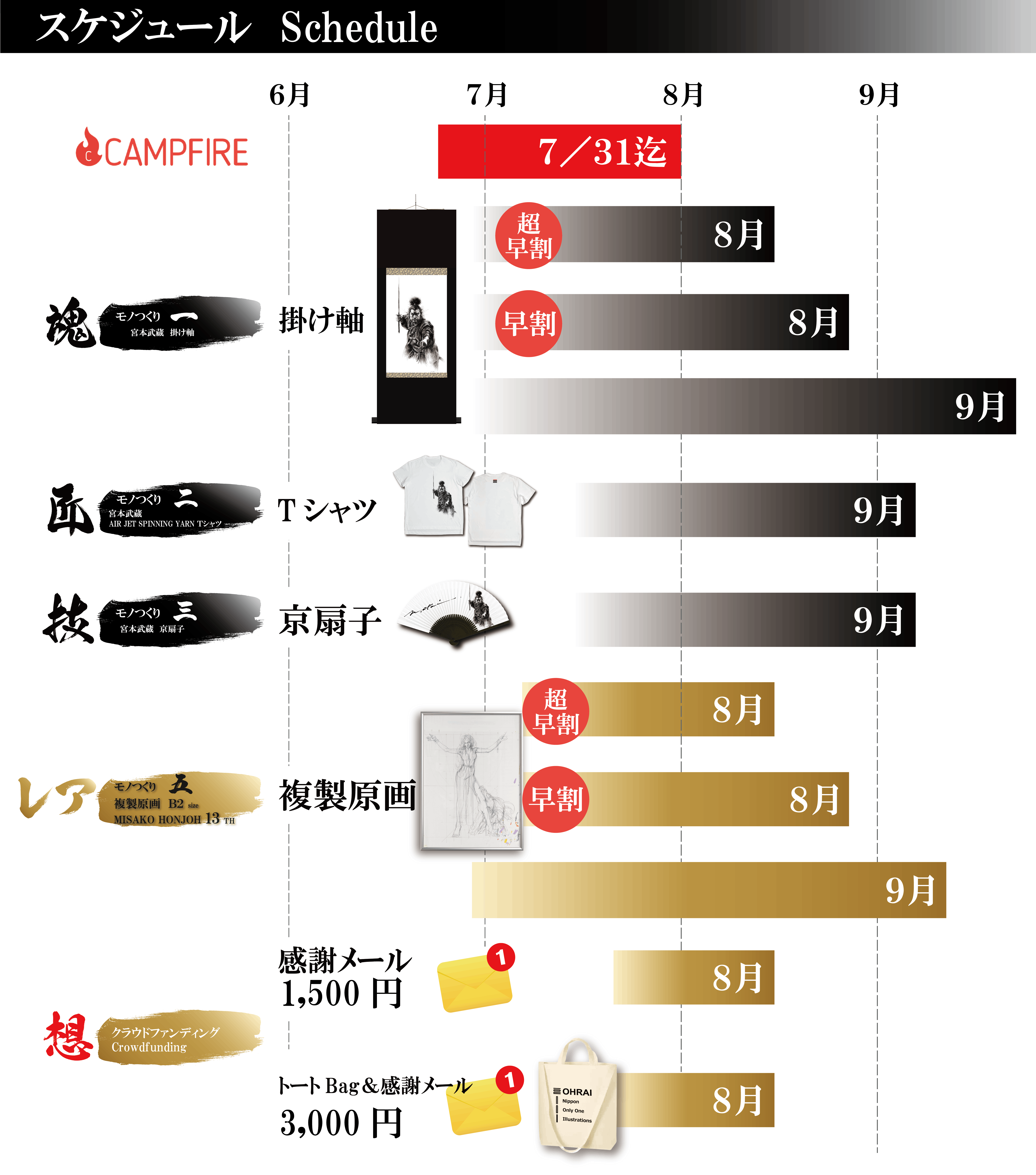 2022/10/28 23:417月31日にプロジェクトが終了して約3か月が経ちました。CAMPFIRE プロジェクト中に頂きましたお声を参考にして、新しい掛け軸作りにチャレンジしました。もう少し小さいミニマルな生活にも溶け込むような掛け軸。使用するイラストも吉川英治「宮本武蔵」から新しく挿絵を加えて仲間入り。吉川英治「宮本武蔵」シリーズはここで一旦終了。今度はMakuake(マクアケ)という新商品販売サイトに出品します。10/29(土)13:00位~からスタート予定です。CAMPFIREと違って事前にページをお見せ出来ないので、改めてお知らせいたします。是非ご覧下さい。 もっと見る