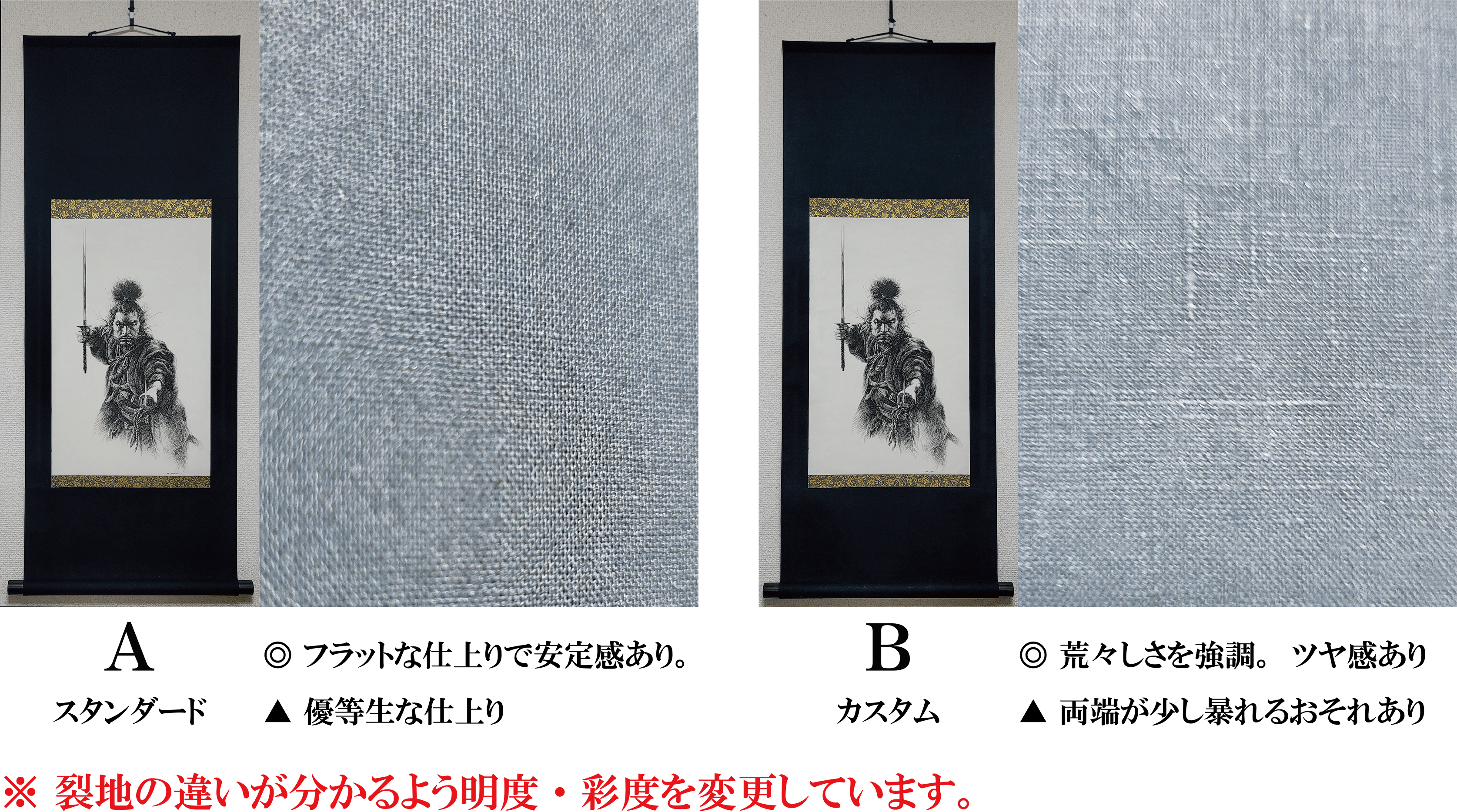 リターンでは常識にとらわれず、【A・B】2タイプの表装裂地を用意。メリット・デメリットを記載しております。A・Bいずれも宮本武蔵のイメージから粗野な素材を使用して渋く存在感のある仕上がりです。