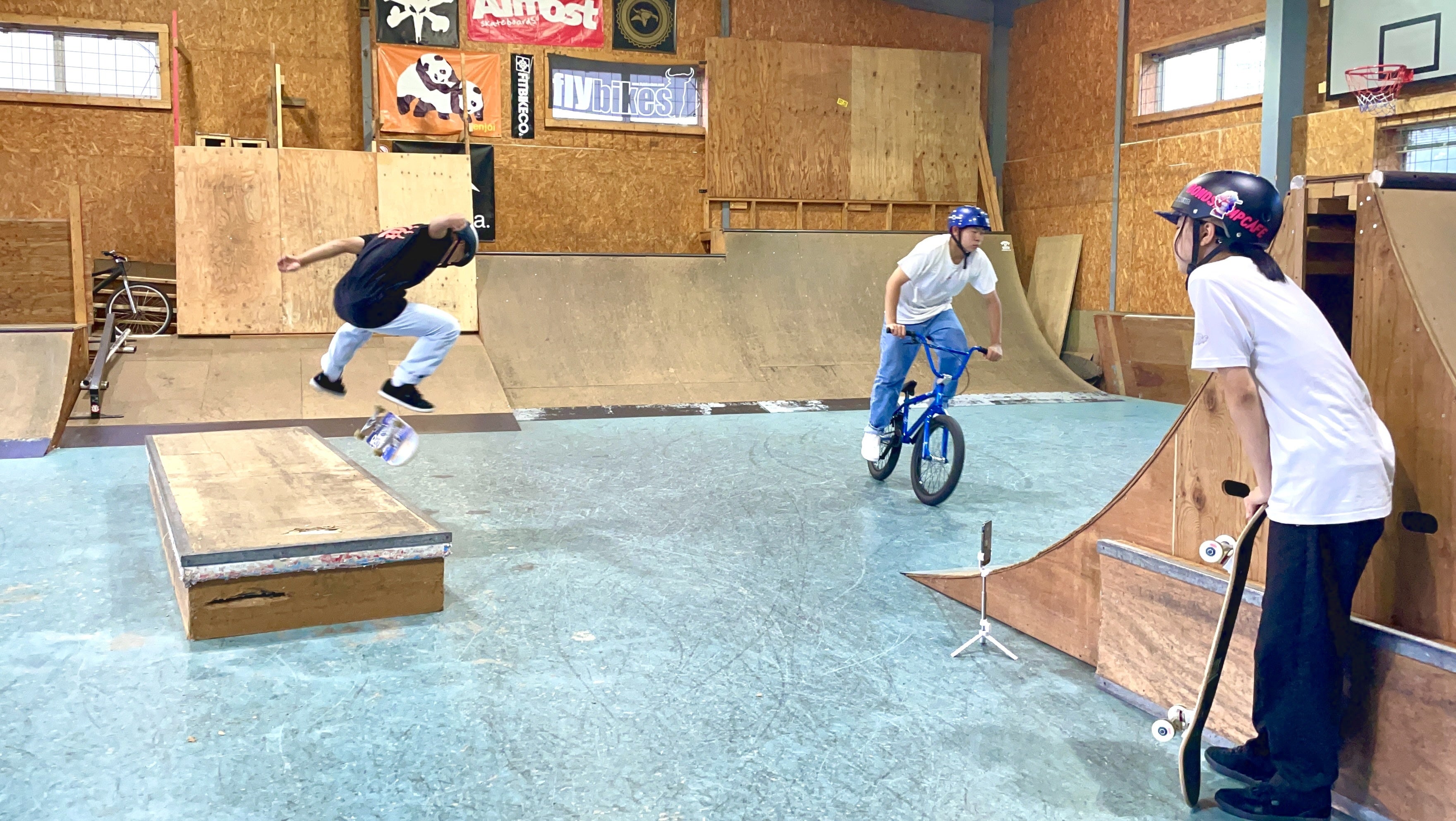 ① 屋内パークで、天候に左右されることなくスケートボード、BMXが楽しめる