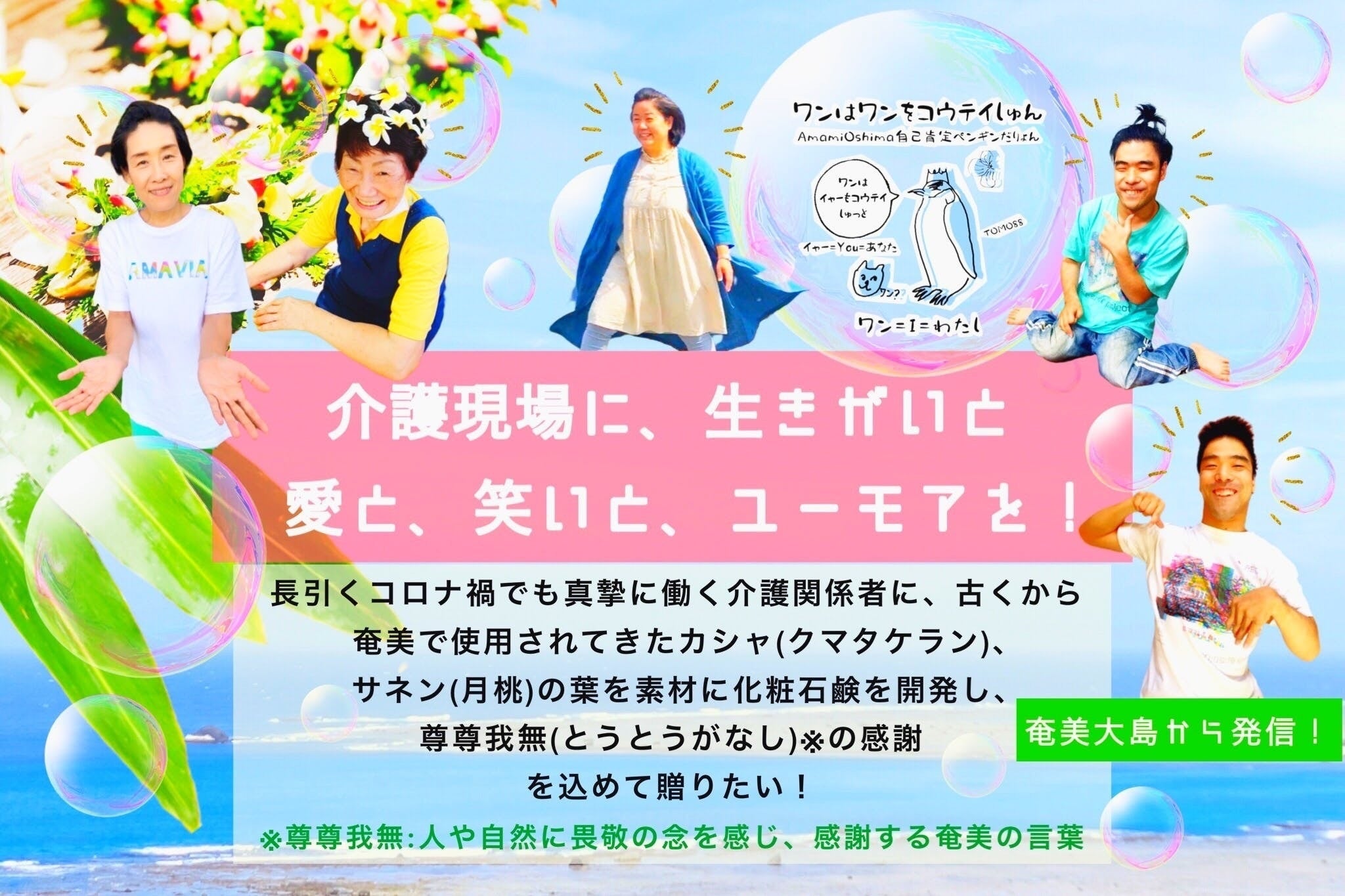 私は、Twins と一緒に活動する中で、介護する人達の優しさにふれ、じぶんの好きなこと、できることは何か?と自問し、奄美の自然素材を使用したアロマ石鹸開発をはじめました。私のヘルパー時代の経験では、介護医療現場では、利用者さんには手厚い心身のケアが整っていましたが、介護する側、ヘルパーさんの心身のケアは充実していないことに気づきました。介護従事者の方々が、その日1日の心身の疲れをスッキリ洗い流し、リフレッシュして活力が湧くような商品を作りたい...