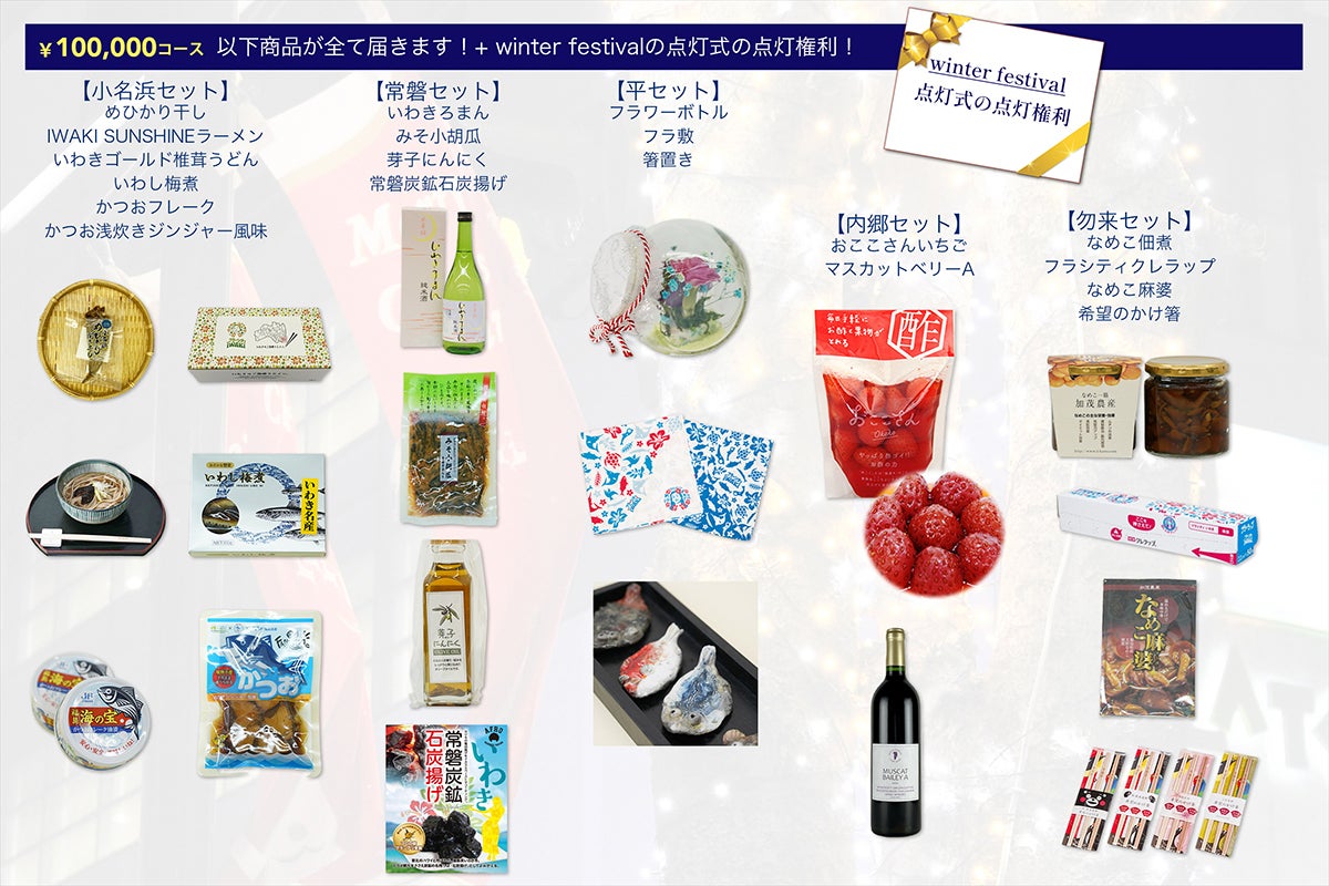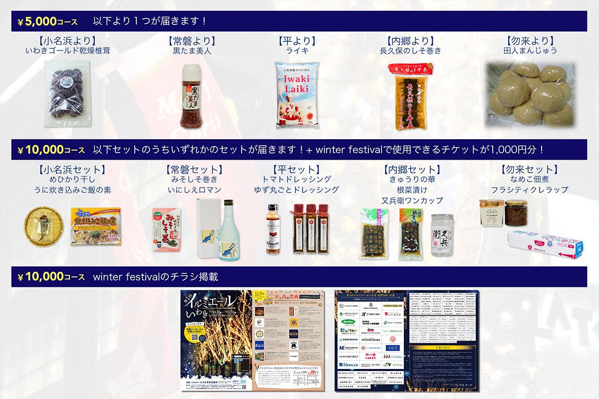 5万円コース:点灯式当日の食のイベントWinter Festivalで使用できる割引券5000円分といわきの特産品セット(下記画像参照)