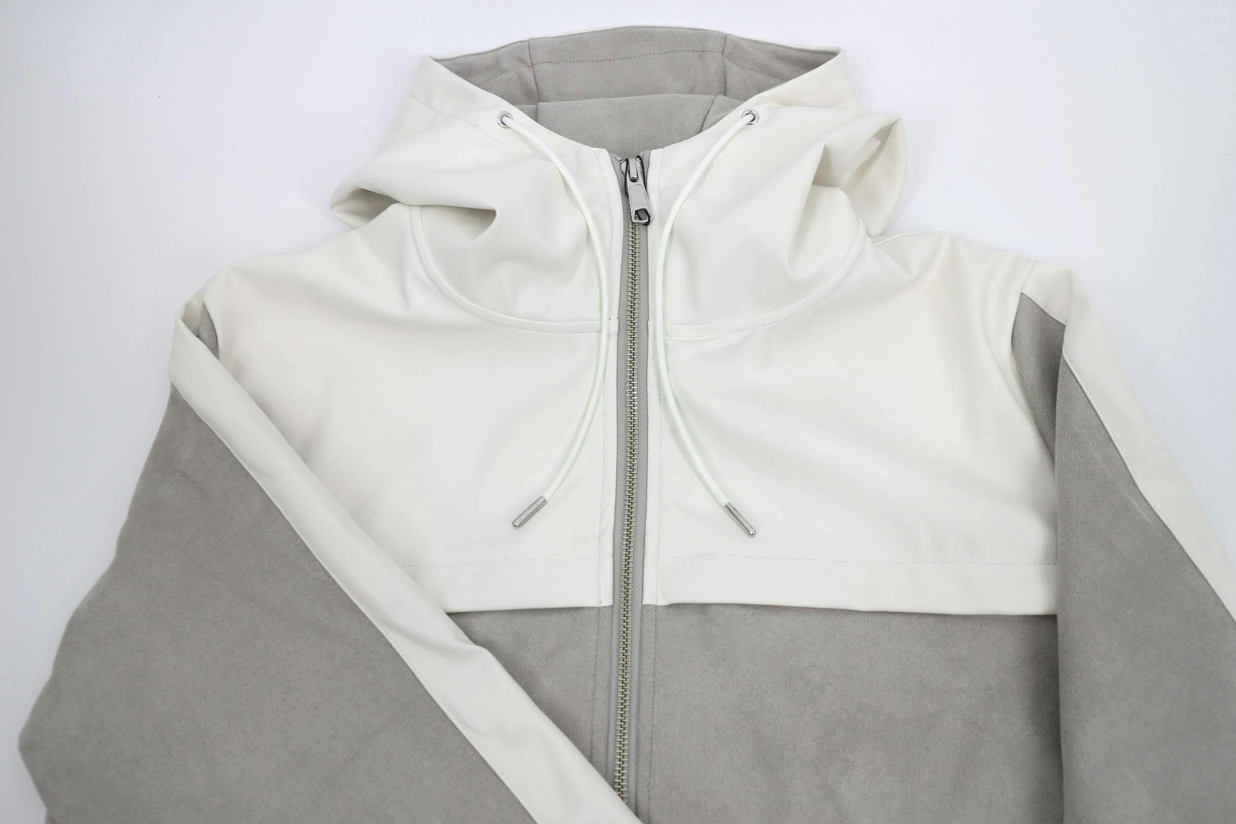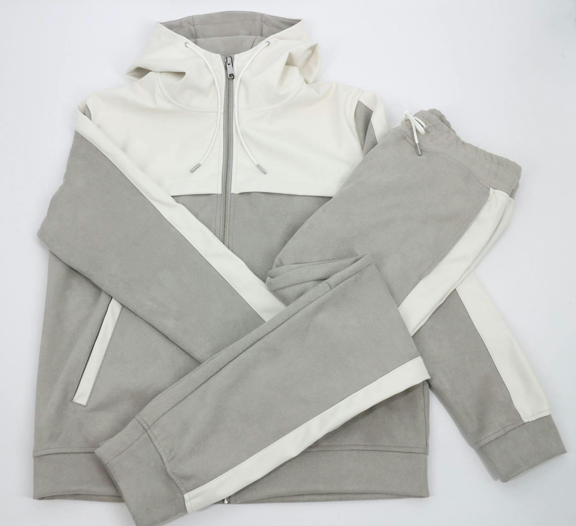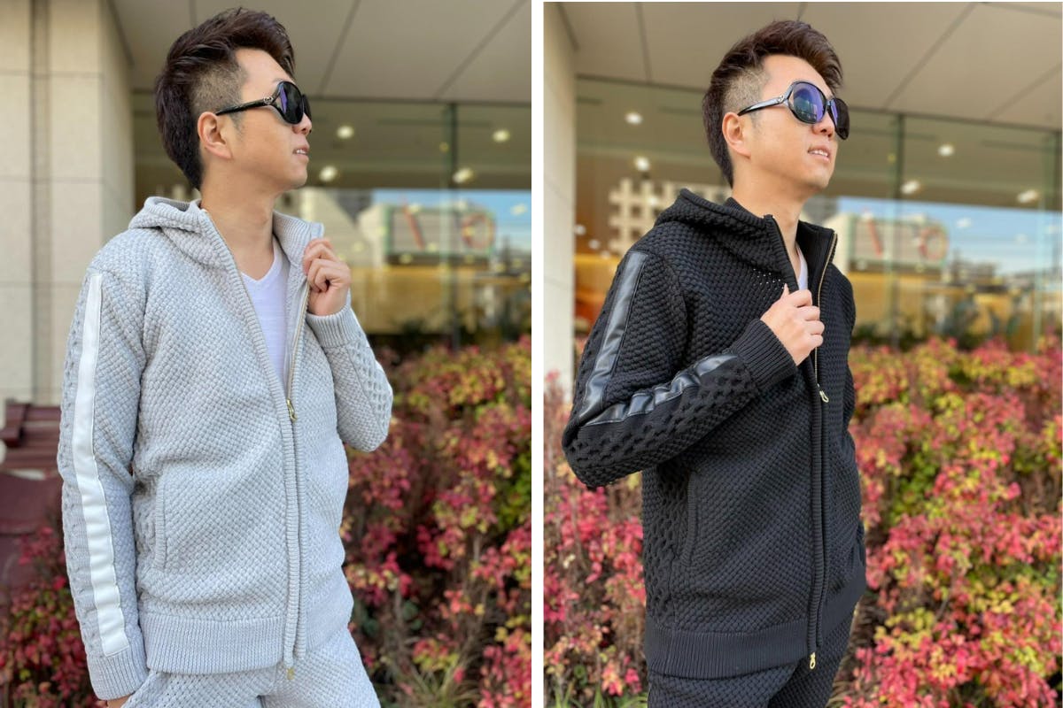 編込みニットセットアップに次いでおすすめのアイテム【スウェード×レザーセットアップ】をご紹介します。スウェード×レザーでモードなデザインながらもパーカーセットアップで程よい抜け感を演出。 色はグレーとブラックの2色展開です。
