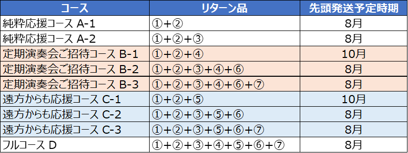 大きく分けて4コース、その中で下表のリターン品組み合わせによって複数設定しています。