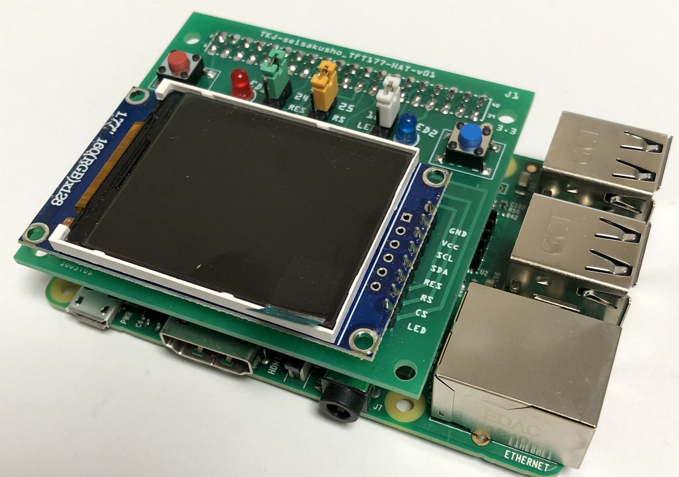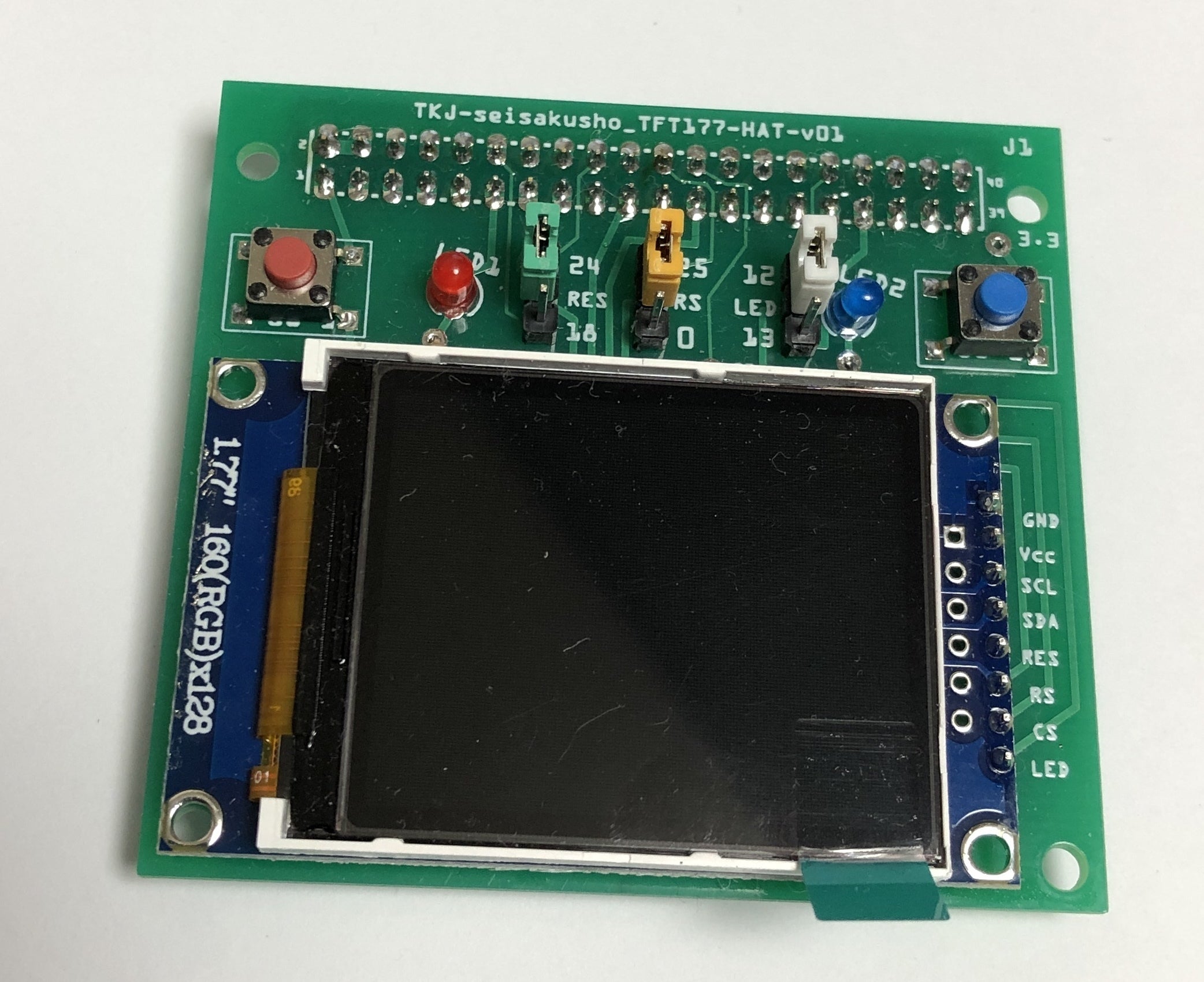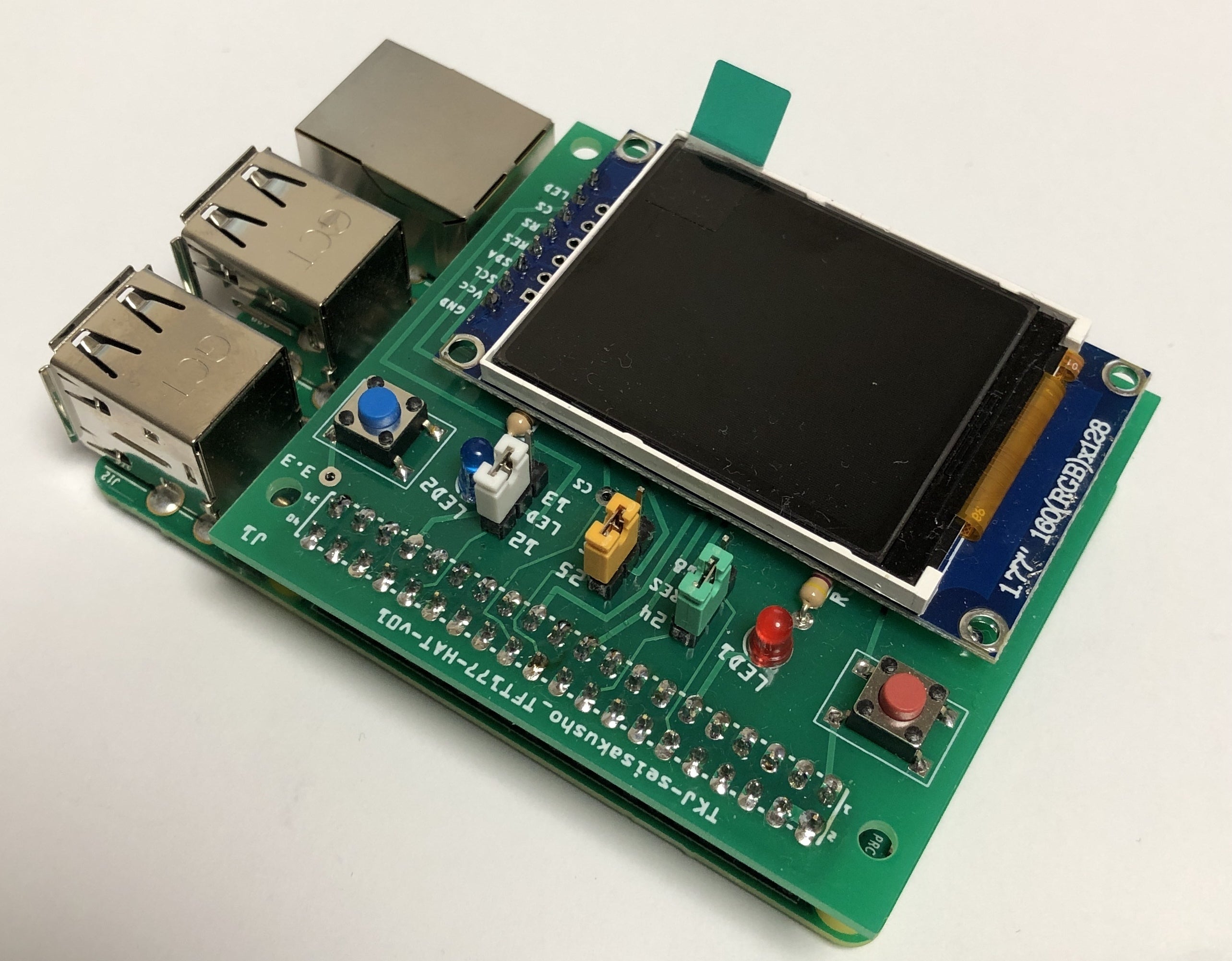 TFT液晶とスイッチ2個、LED2個を実装したテスト用のラズパイ専用HATです。
