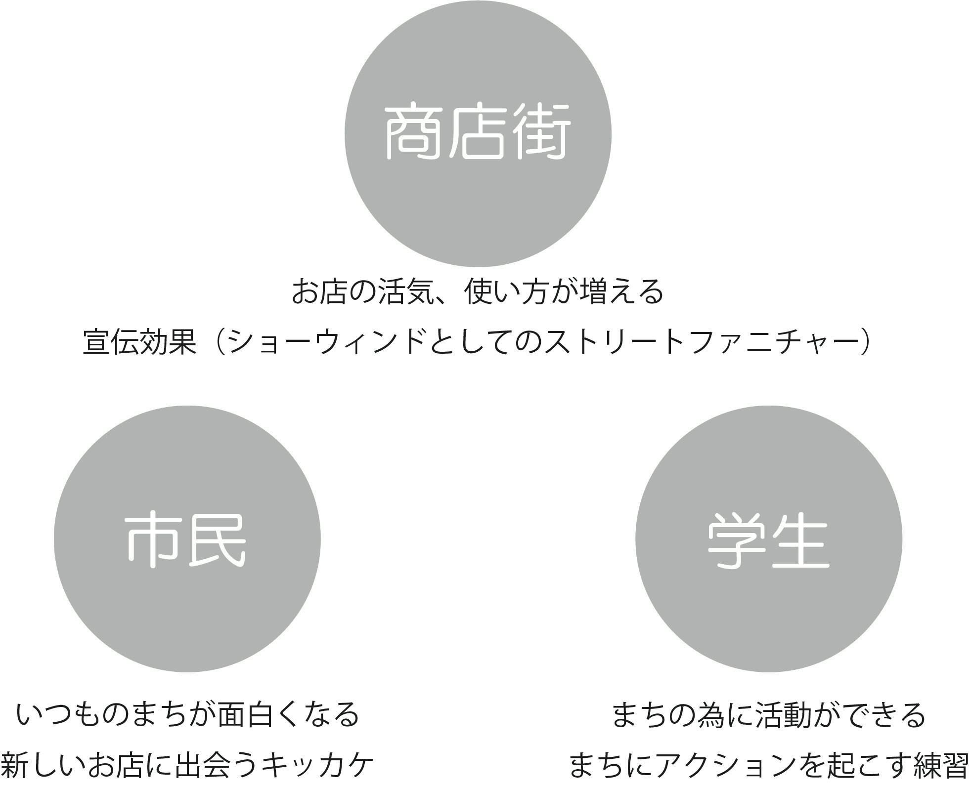 また、街にストリートファニチャーという滞在場所が増えることで、散歩や、道での会話の機会が増える、そして今までお店の中で納まっていたにぎわいを道に滲み出させることができる。