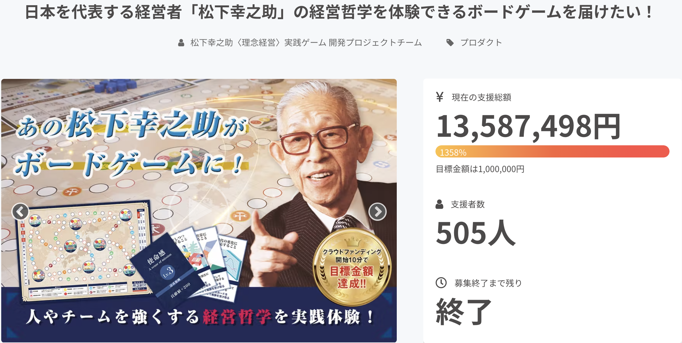 2022/08/01 11:24松下幸之助<理念経営>実践ゲームのクラウドファンディングが総勢505名様からの合計13,587,498円のご支援をいただき、目標金額の1358%を達成し、終了しました!ここまでの結果を残すことができたのも、多くの方からのご支援や応援をいただくことができたからです!本当に2ヶ月間、ありがとうございました!今回のゲームをご支援いただいた皆様の元へは、早急にお届けできるように配送準備を進めてまいりますので、到着まで、お楽しみにお待ちください。引き続き、松下幸之助<理念経営>実践ゲームをよろしくお願い致します! もっと見る