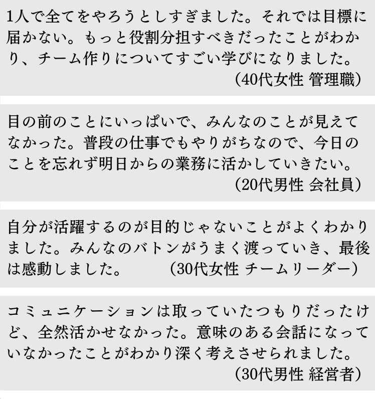 インプットだけでは人生は変わらず、得た知識をアウトプットすることが大切で、「実践」が様々な経験をもたらし、自分やチームを少しずつ変えてくれます。私たちが成長・変化する際の最も大きな障壁となる「体験=アウトプット」を得られるのが、このボードゲームの特徴です。