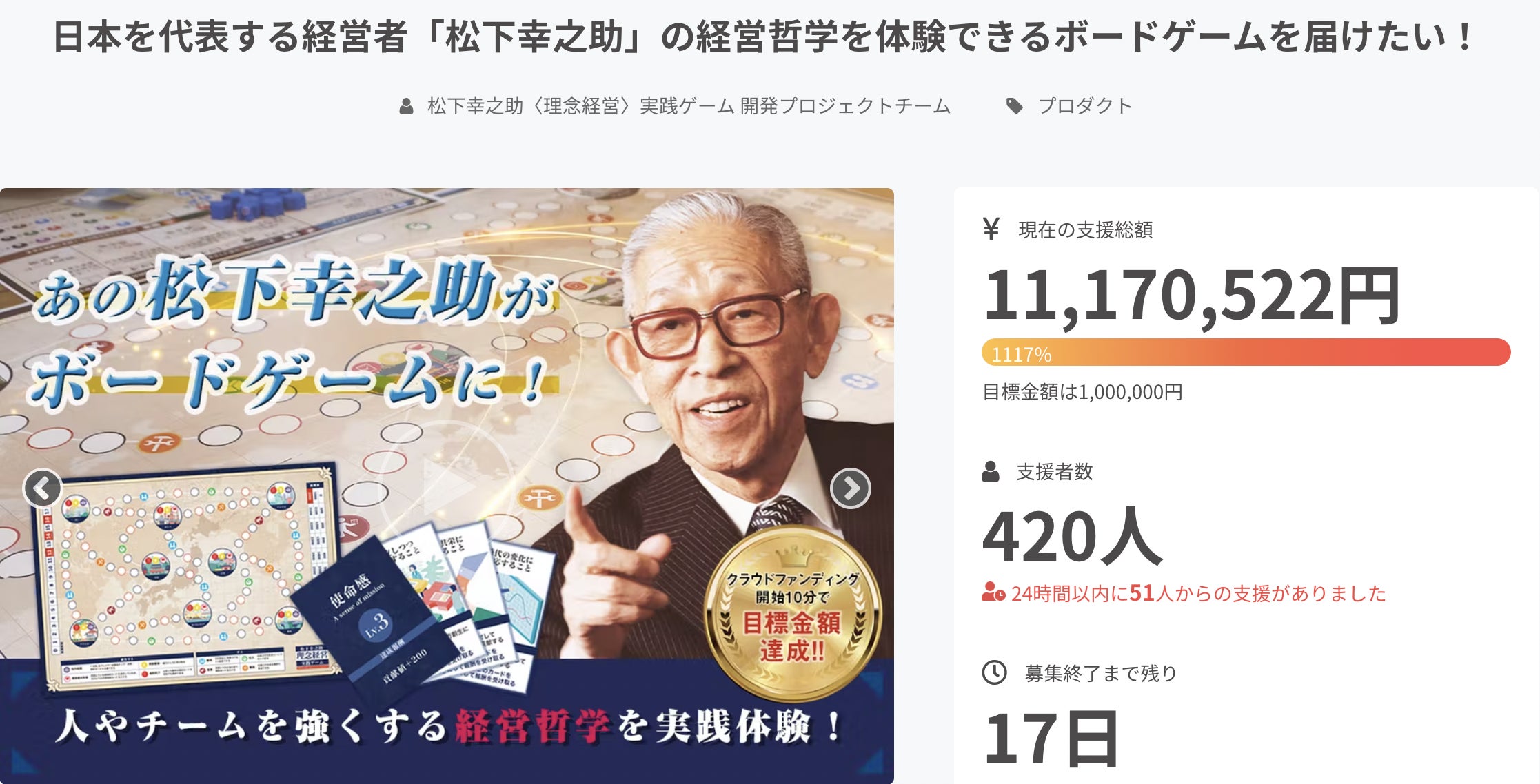 2022/07/14 19:00ついにこの「松下幸之助<理念経営>実践ゲーム」のクラウドファンディングプロジェクトの支援金額が1000万円を突破しました!これも、たくさんの方にご賛同・応援・ご支援をいただけたおかげです!皆様のお力がなければ、到底ここまでたどり着くことはできなかったと思います!本当にありがとうございます!感謝してもしきれません!クラウドファンディングプロジェクトは残りわずかとなりましたが、最後までこのプロジェクトを盛り上げていければと思いますので、引き続き、よろしくお願い致します! もっと見るプロモーションムービーが完成しました!